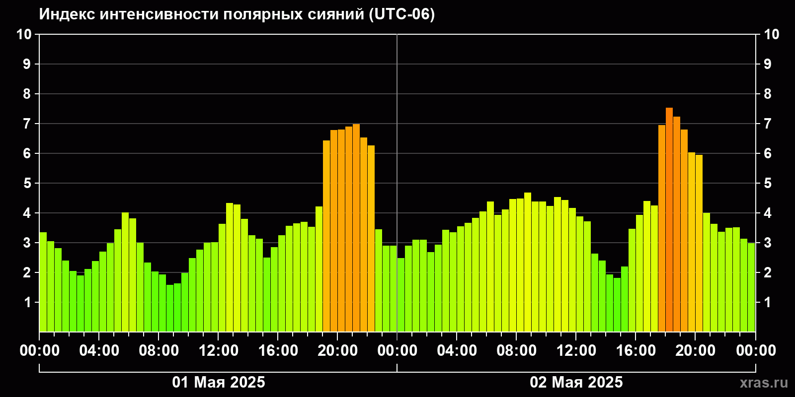 Изменения индекса интенсивности полярных сияний с 2025-05-01 по 2025-05-02 по местному времени