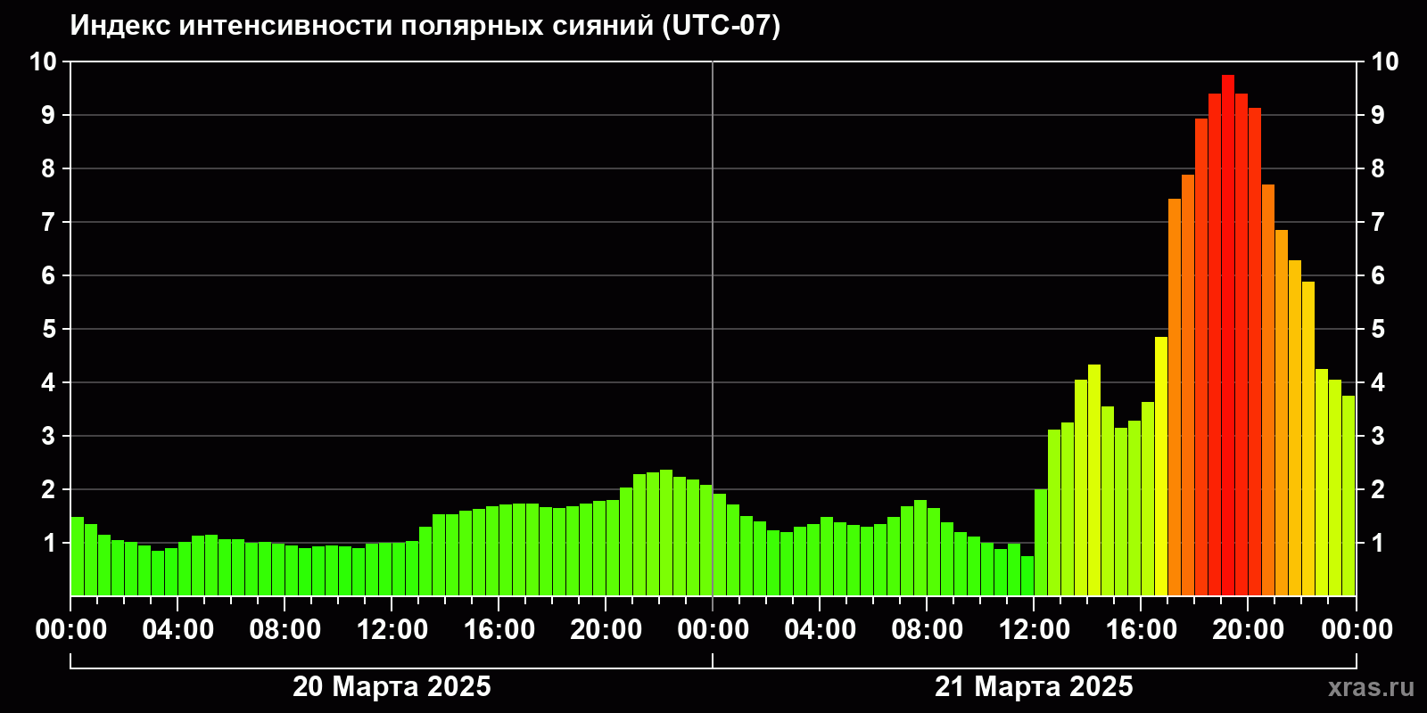 Изменения индекса интенсивности полярных сияний с 2025-03-20 по 2025-03-21 по местному времени