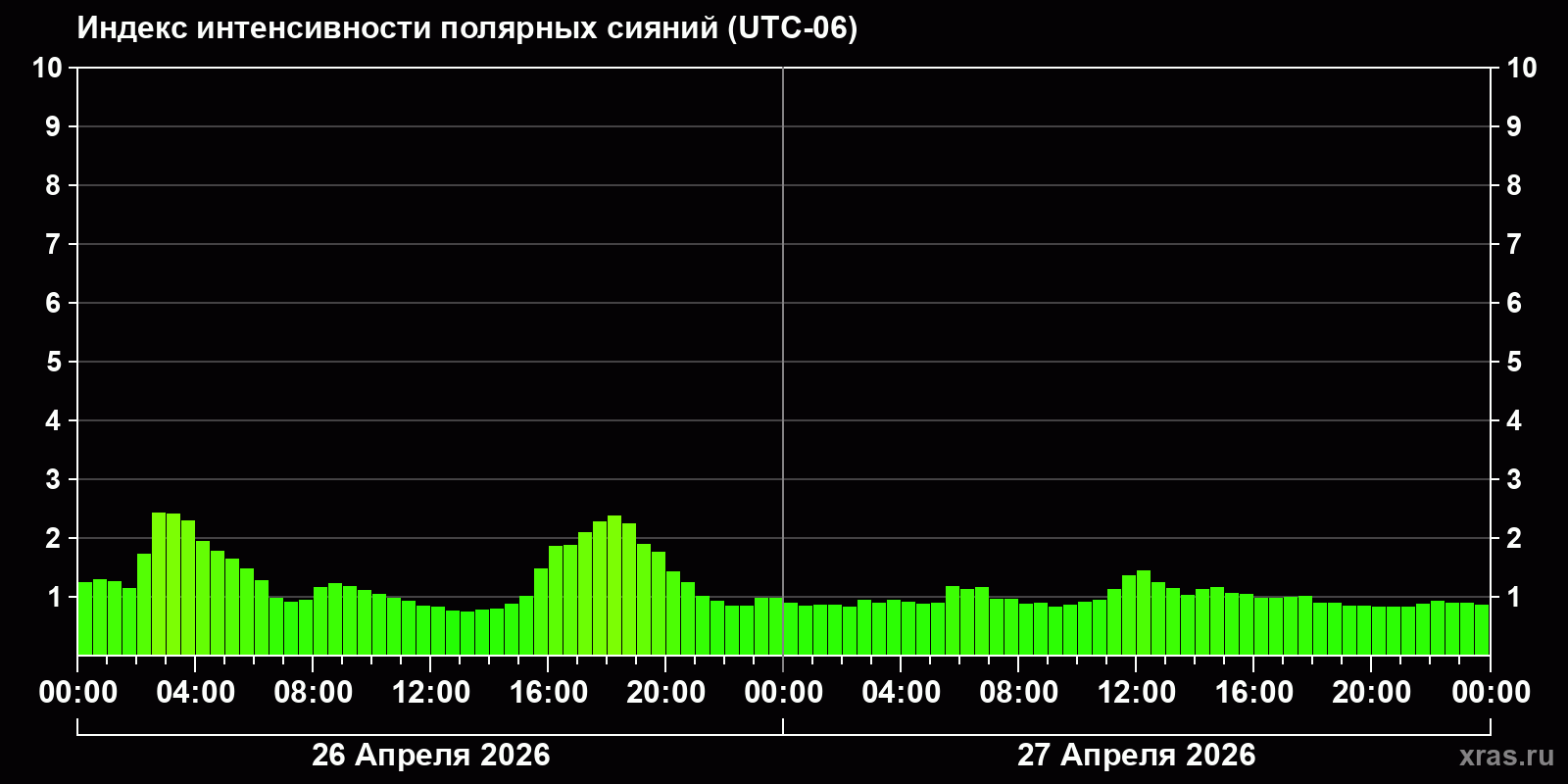 Изменения индекса интенсивности полярных сияний с 2026-04-26 по 2026-04-27 по местному времени
