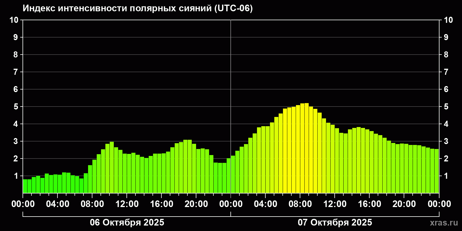 Изменения индекса интенсивности полярных сияний с 2025-10-06 по 2025-10-07 по местному времени
