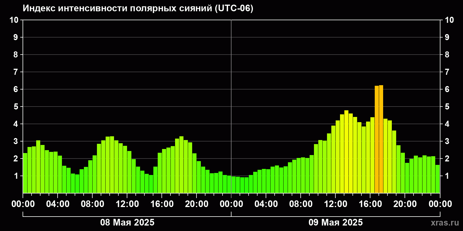 Изменения индекса интенсивности полярных сияний с 2025-05-08 по 2025-05-09 по местному времени