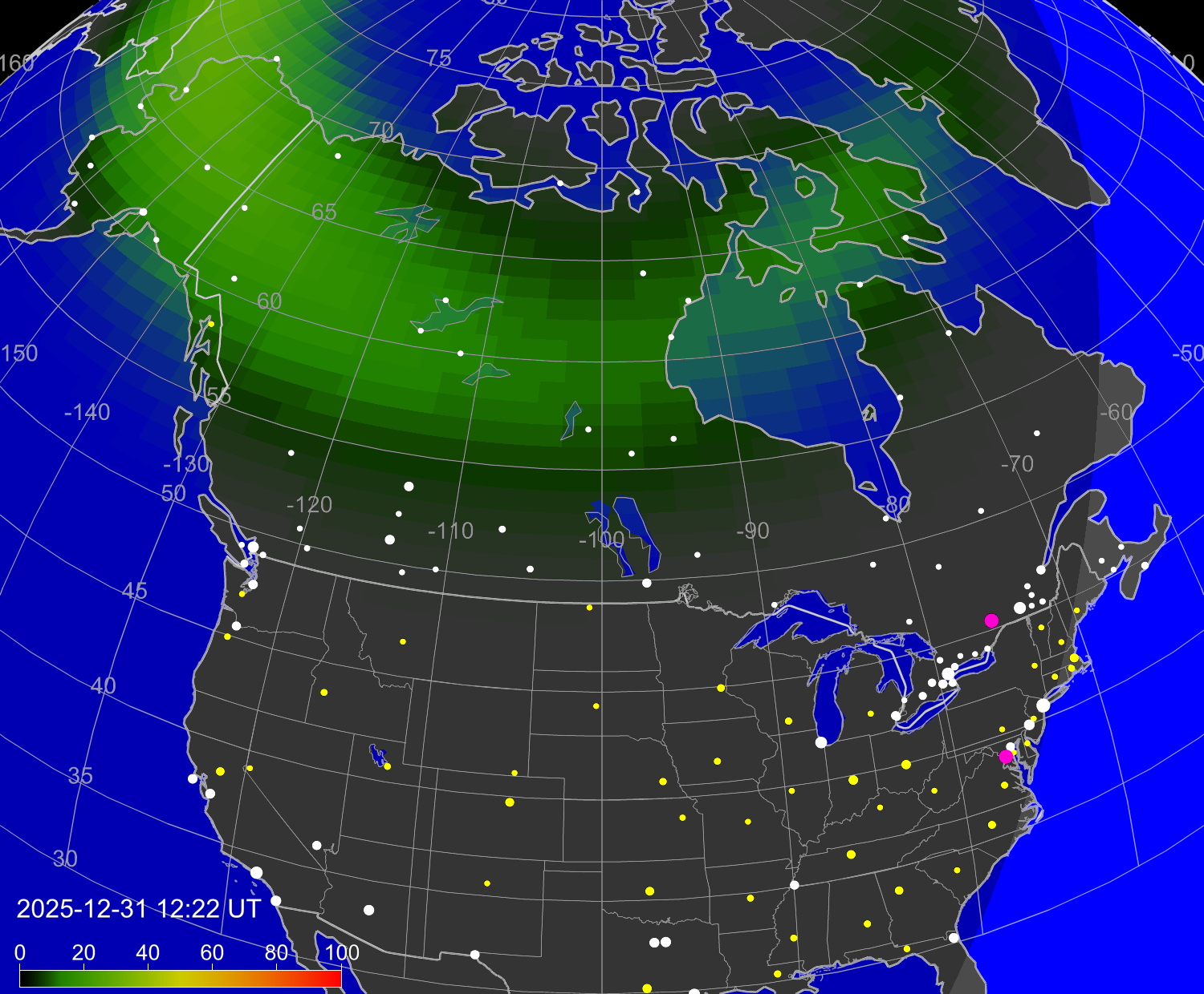 Изменения и часовой прогноз индекса интенсивности полярных сияний с 2025-12-31 по 2026-01-01