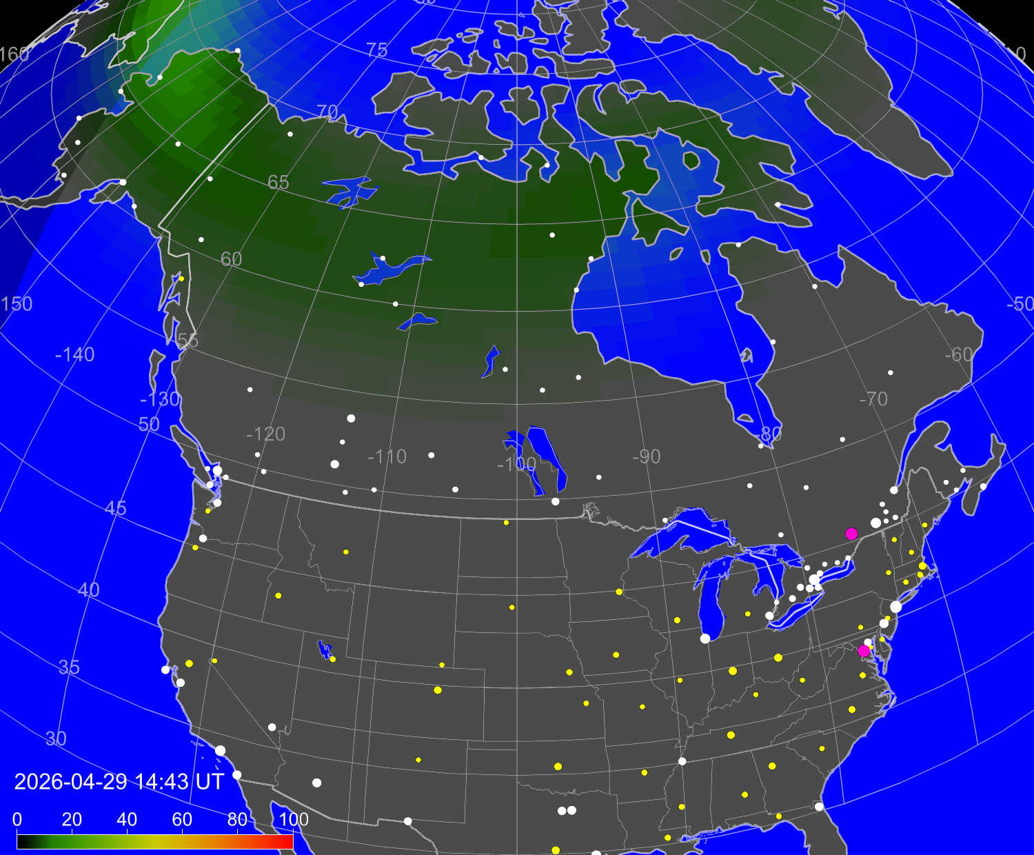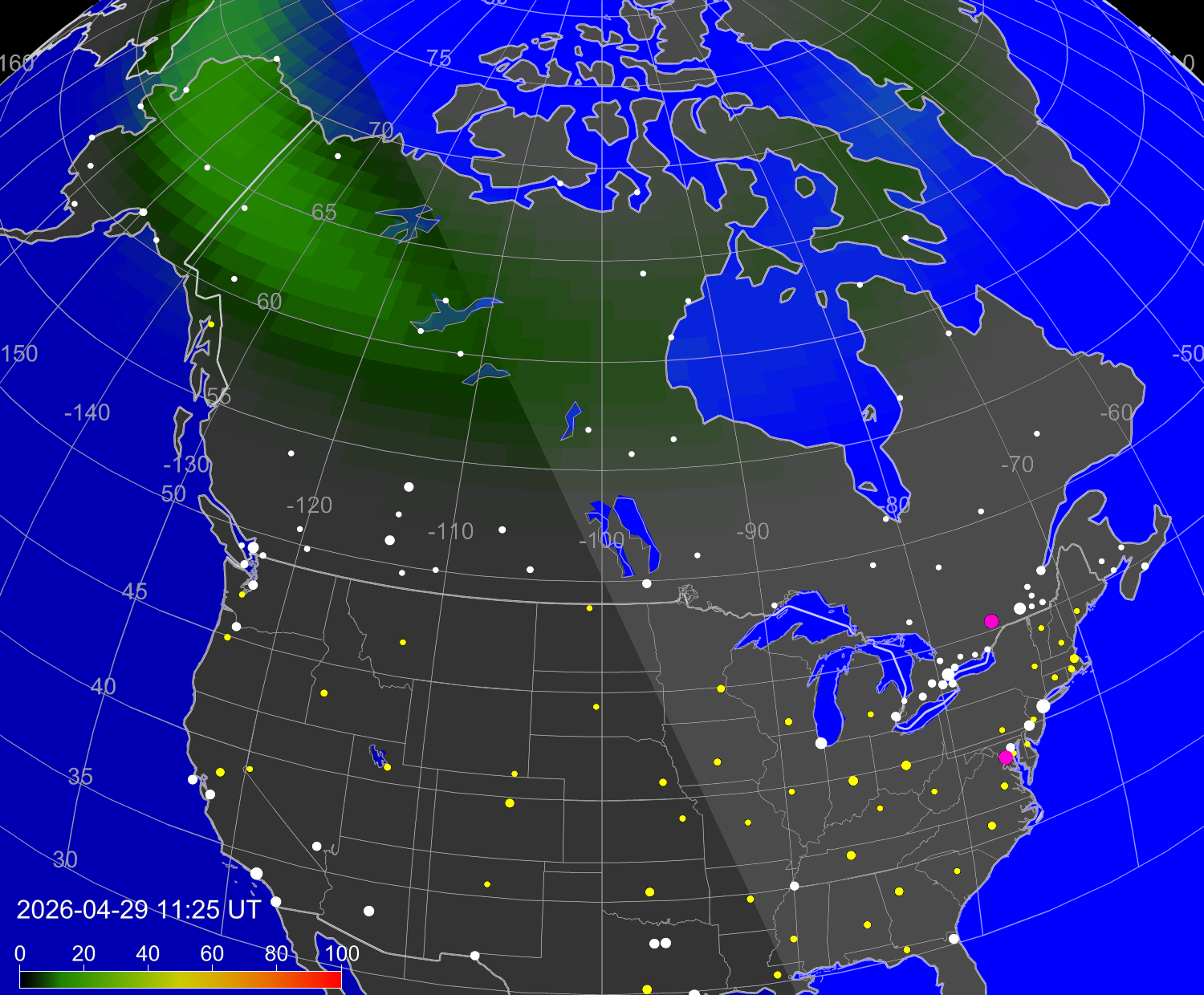 Вероятность полярных сияний в городах США