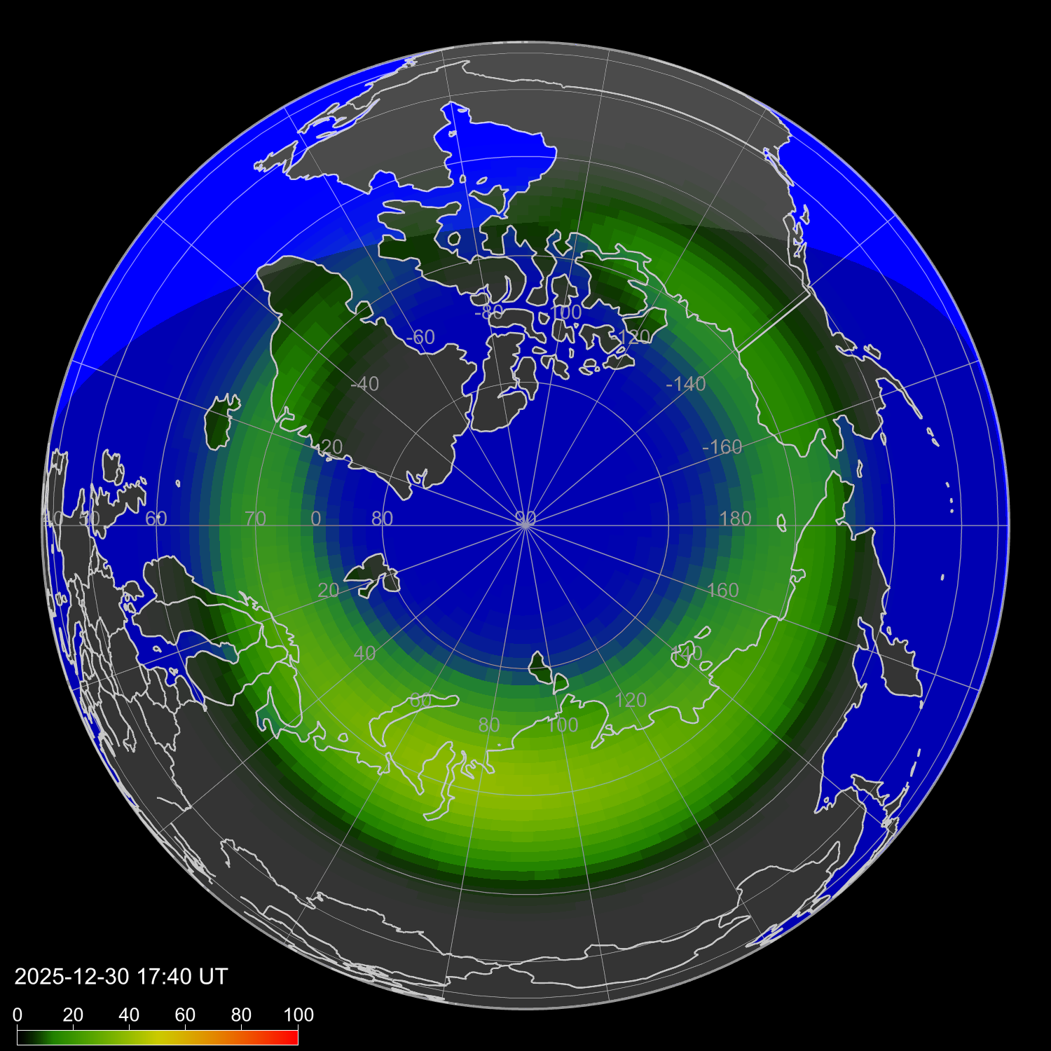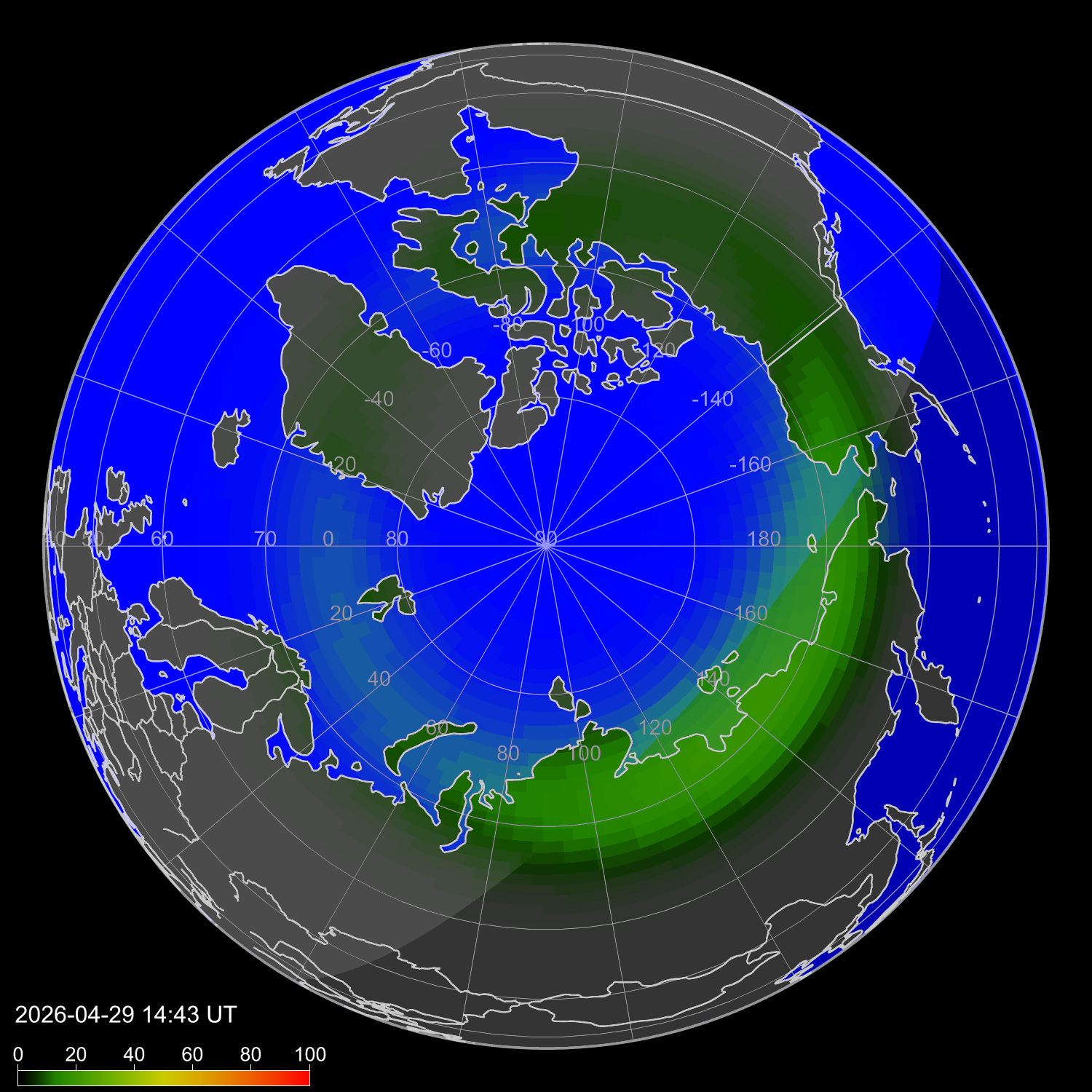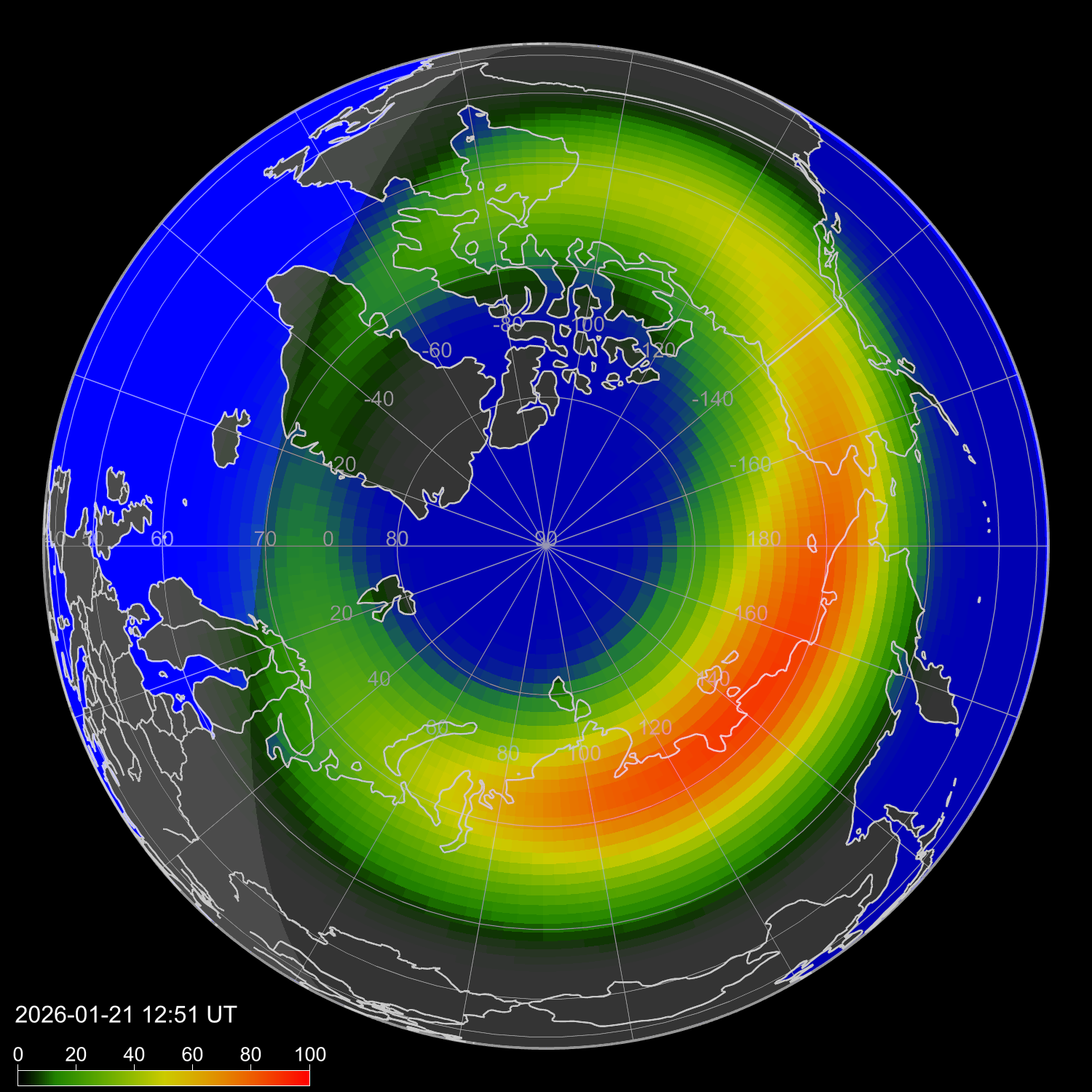 Индекс интенсивности полярных сияний и теоретически возможная широта наблюдений для ночного времени в западном полушарии
