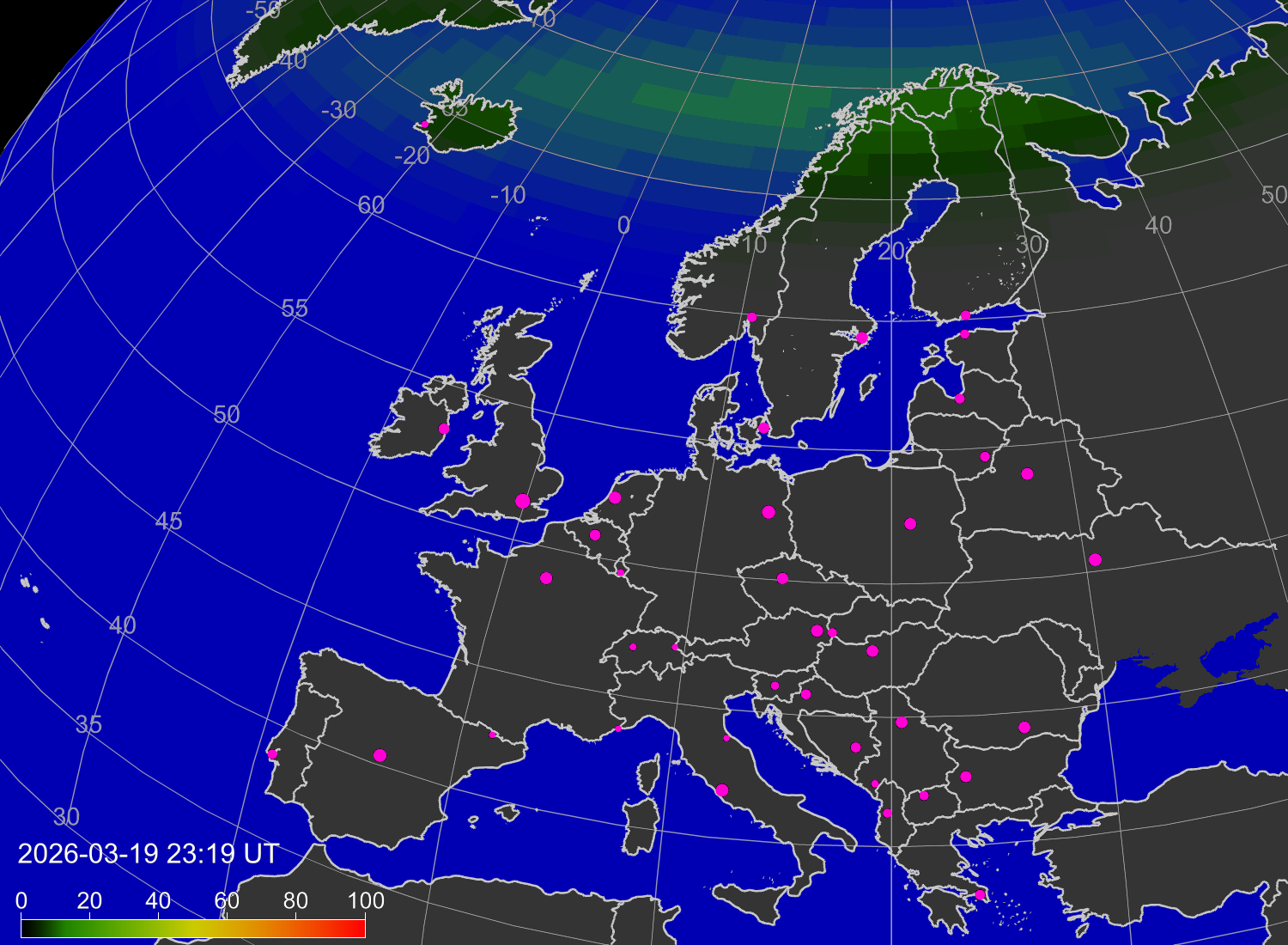 Индекс интенсивности полярных сияний и теоретически возможная широта наблюдений для ночного времени в восточном полушарии