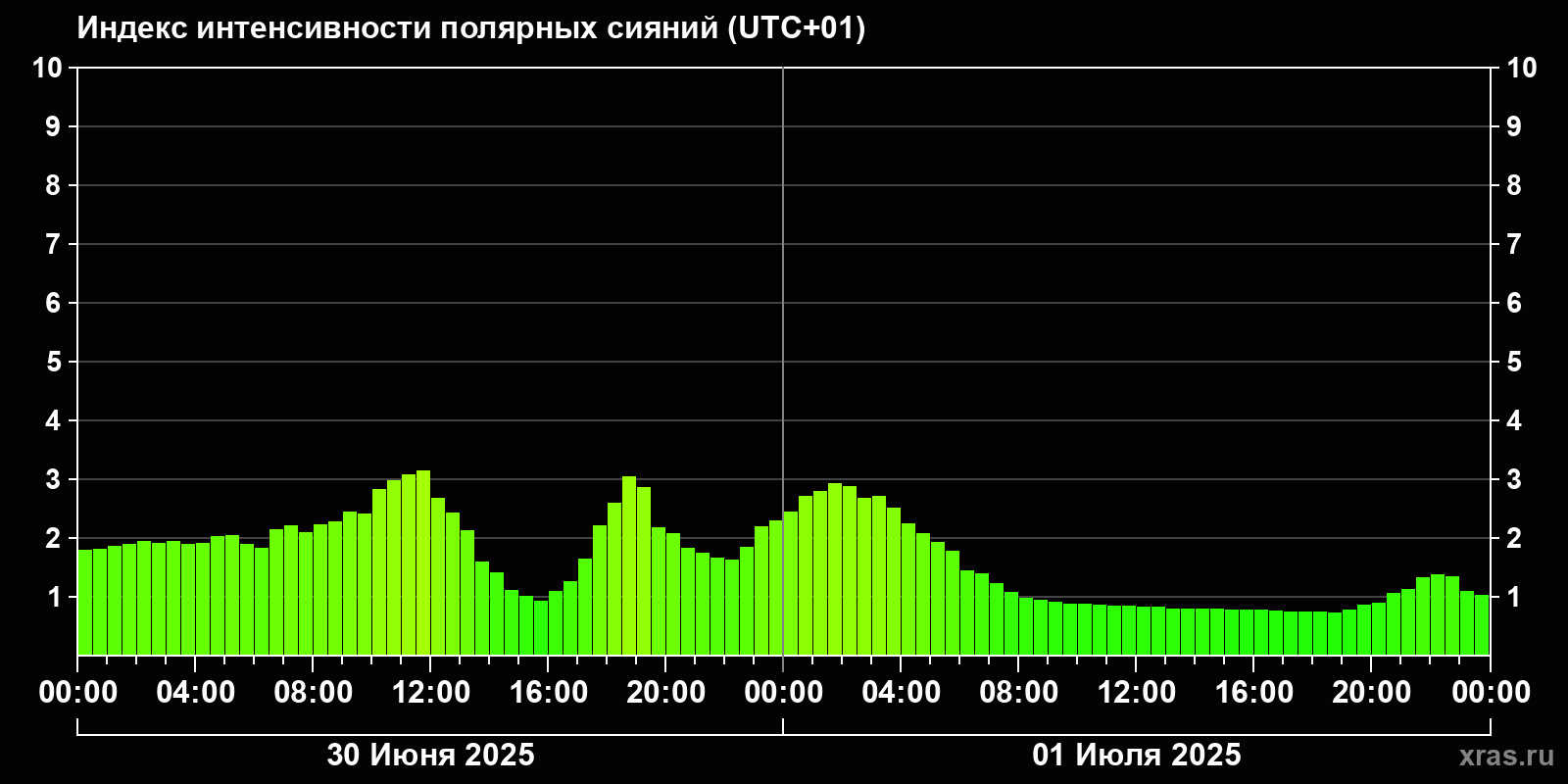Изменения индекса интенсивности полярных сияний с 2025-06-30 по 2025-07-01 по местному времени