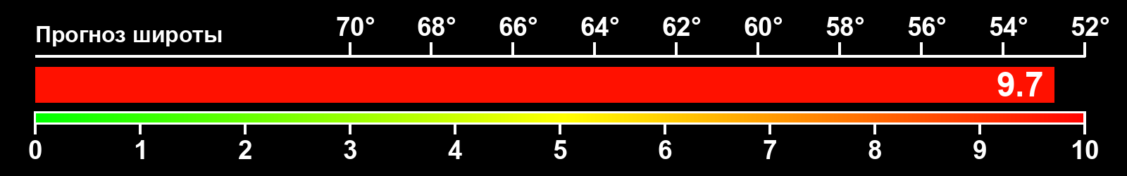 Индекс интенсивности полярных сияний и теоретически возможная широта наблюдений для ночного времени в восточном полушарии по состоянию на 2025-12-10 23:52 (конец дня) по местному времени