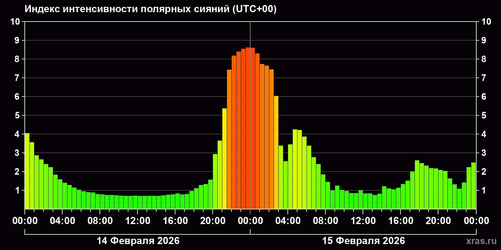 Изменения индекса интенсивности полярных сияний с 2026-02-14 по 2026-02-15 по местному времени