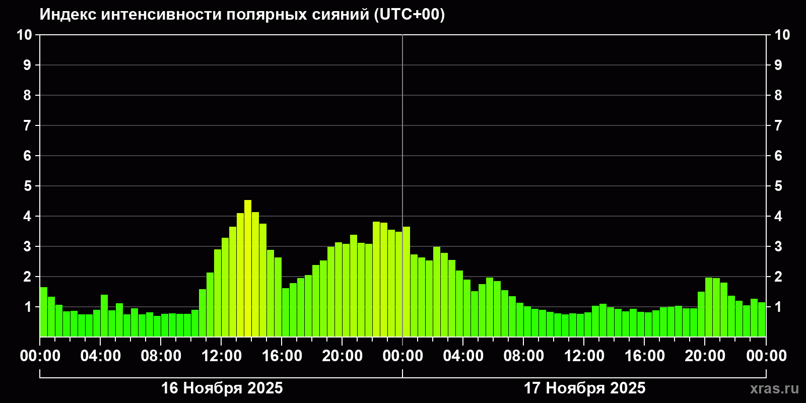 Изменения индекса интенсивности полярных сияний с 2025-11-16 по 2025-11-17 по местному времени