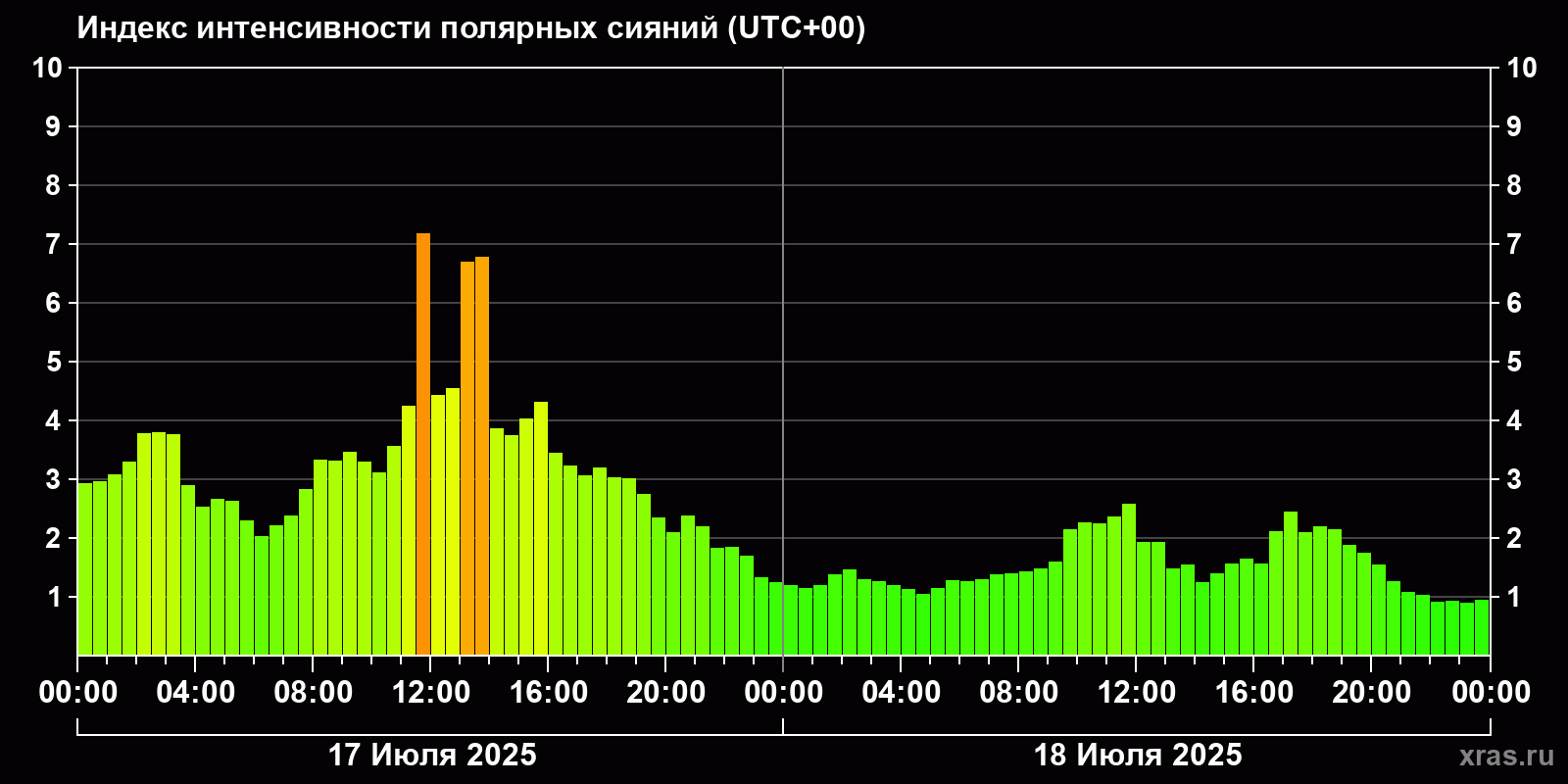 Изменения индекса интенсивности полярных сияний с 2025-07-18 по 2025-07-19 по местному времени