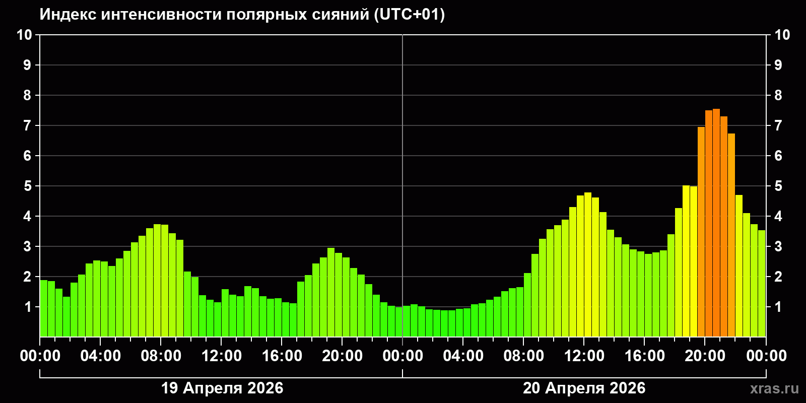 Изменения индекса интенсивности полярных сияний с 2026-04-19 по 2026-04-20 по местному времени