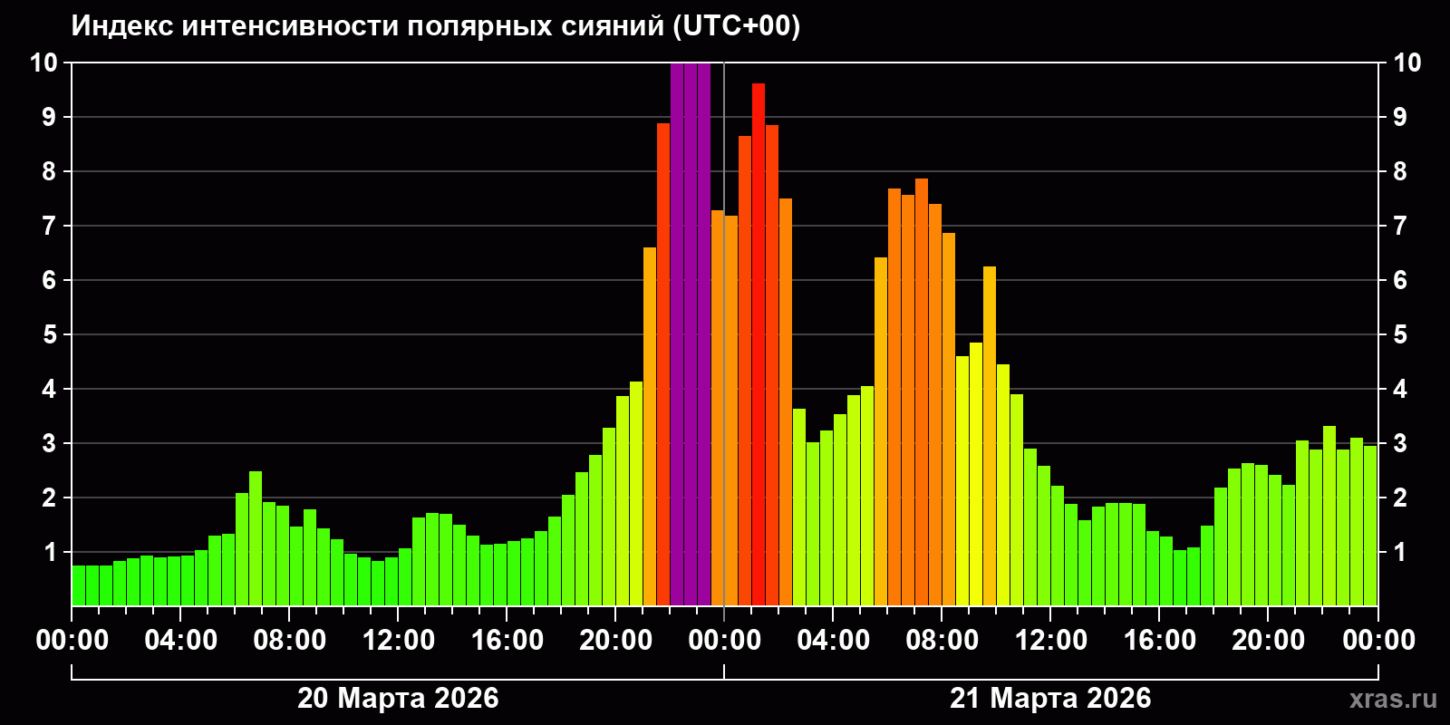 Изменения индекса интенсивности полярных сияний с 2026-03-20 по 2026-03-21 по местному времени