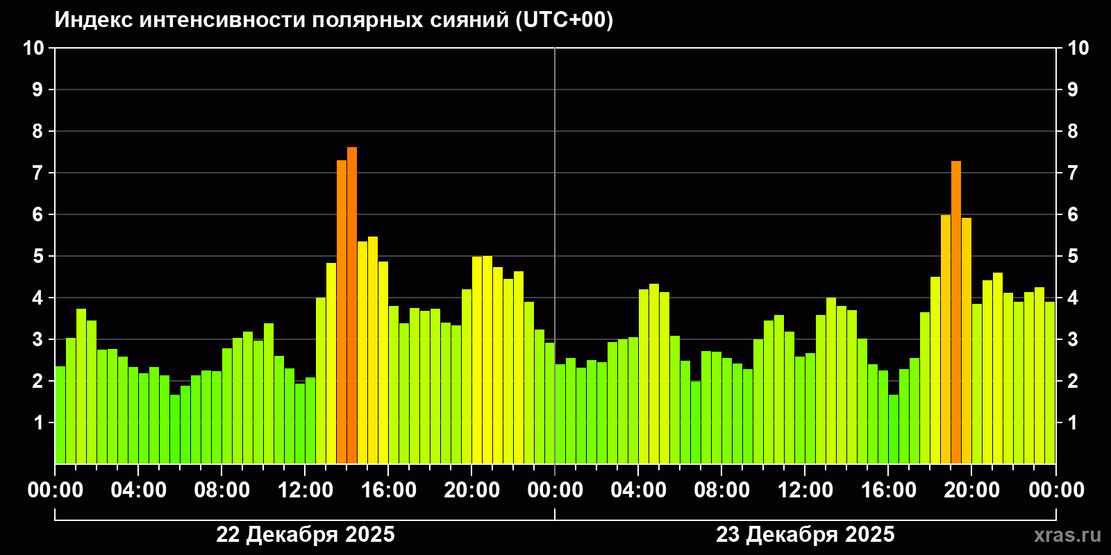 Изменения индекса интенсивности полярных сияний с 2025-12-22 по 2025-12-23 по местному времени