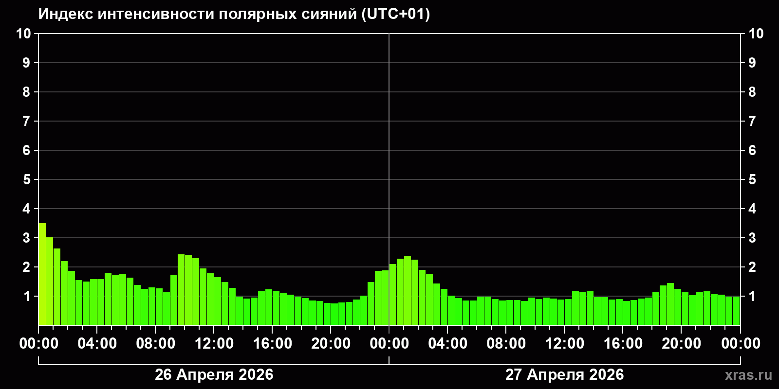 Изменения индекса интенсивности полярных сияний с 2026-04-26 по 2026-04-27 по местному времени