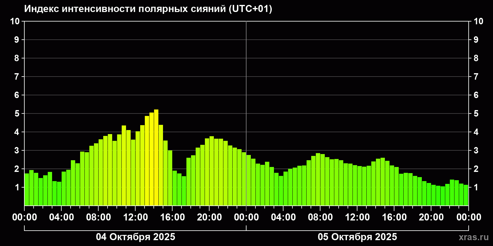 Изменения индекса интенсивности полярных сияний с 2025-10-04 по 2025-10-05 по местному времени