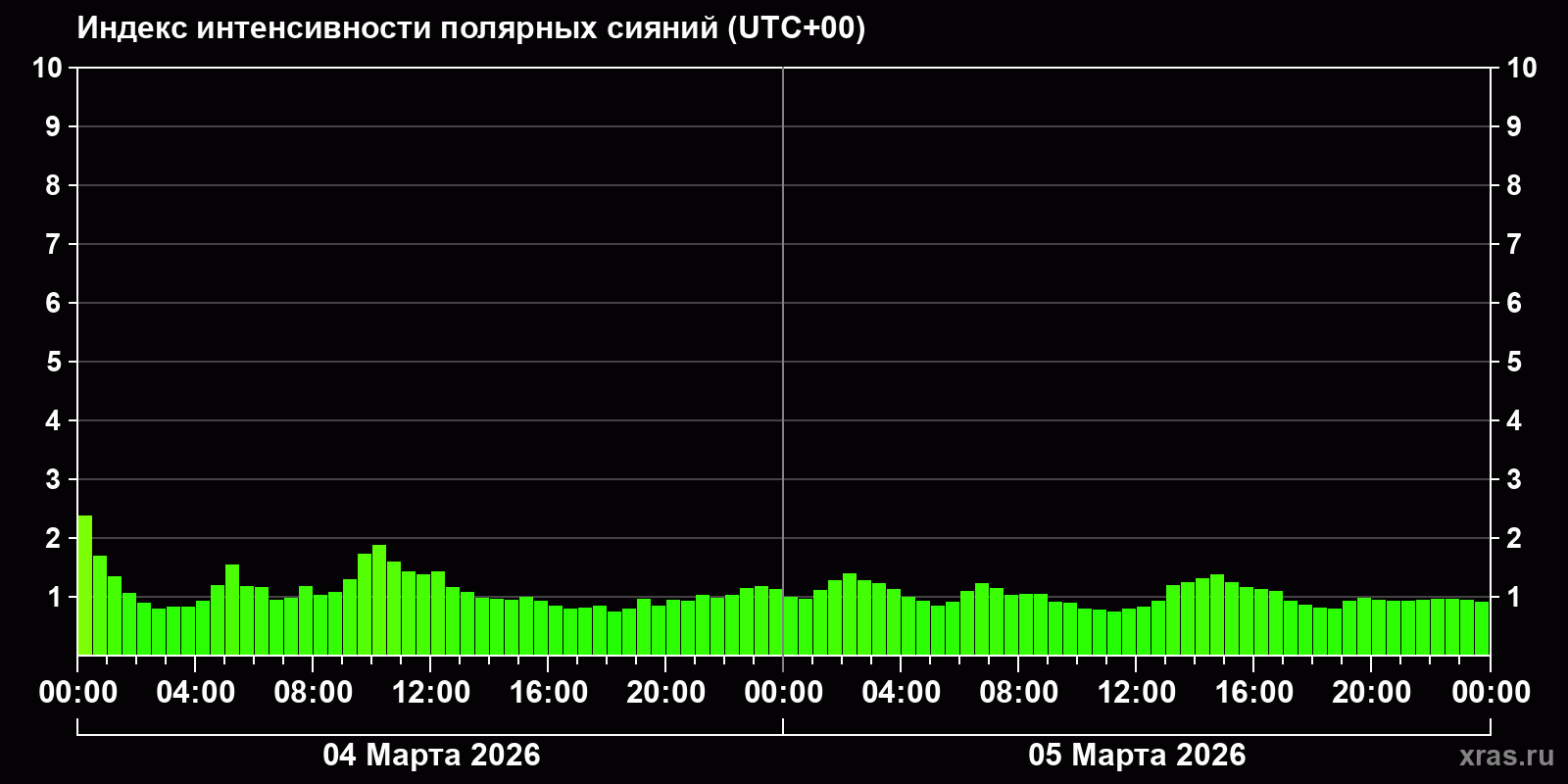 Изменения индекса интенсивности полярных сияний с 2026-03-04 по 2026-03-05 по местному времени
