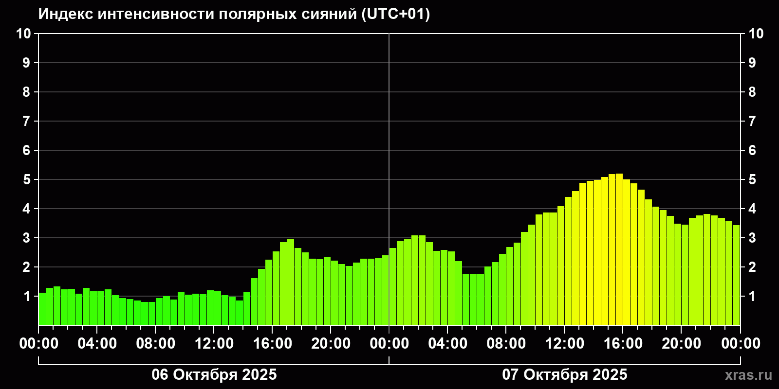 Изменения индекса интенсивности полярных сияний с 2025-10-06 по 2025-10-07 по местному времени