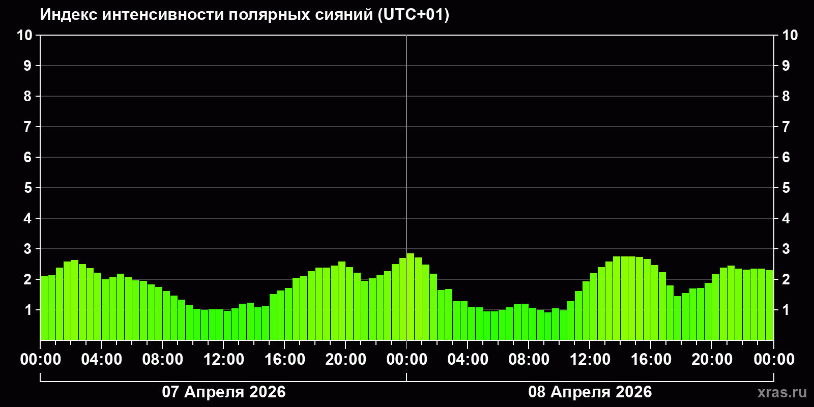 Изменения индекса интенсивности полярных сияний с 2026-04-07 по 2026-04-08 по местному времени