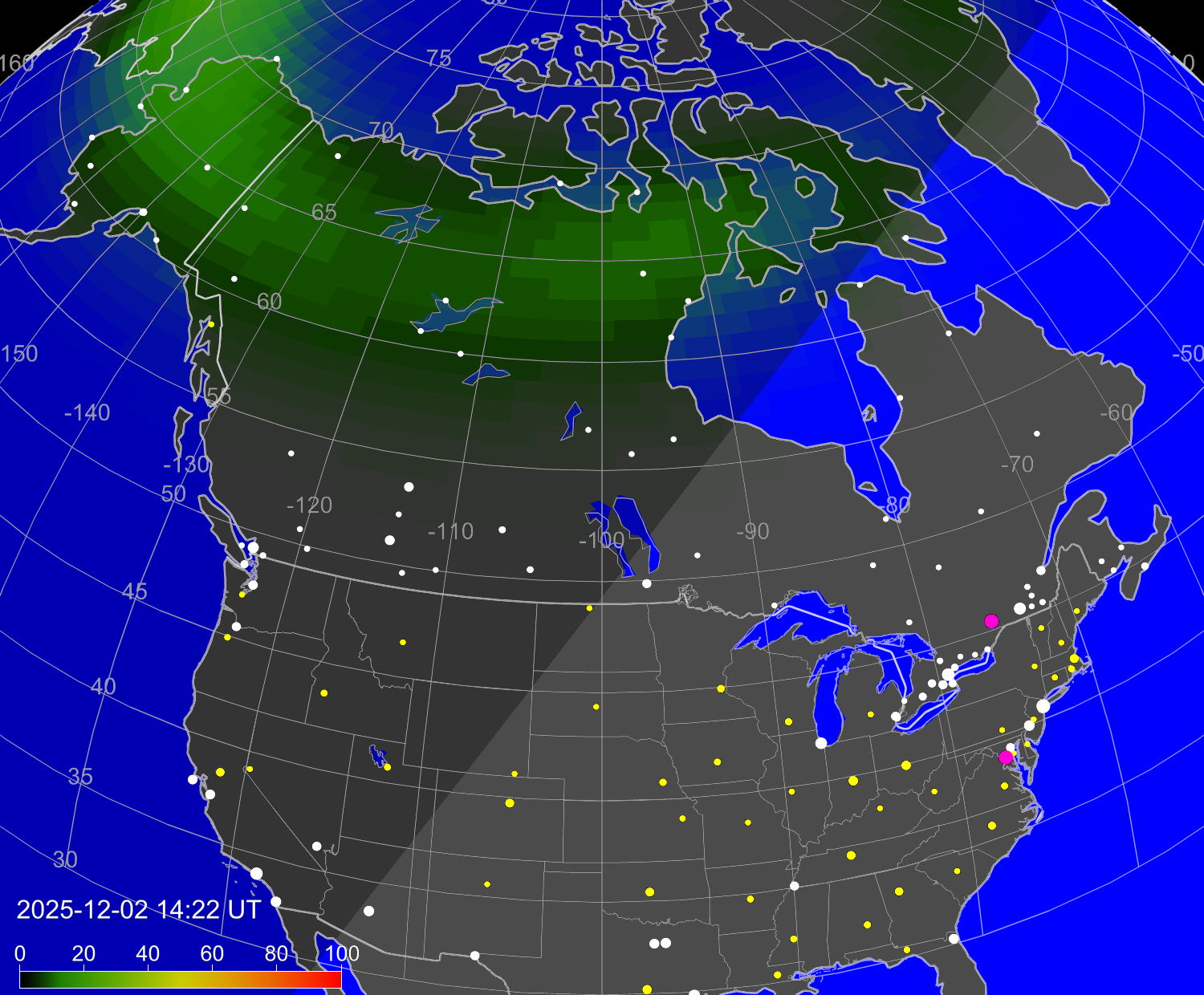 Изменения и часовой прогноз индекса интенсивности полярных сияний с 2025-11-30 по 2025-12-01