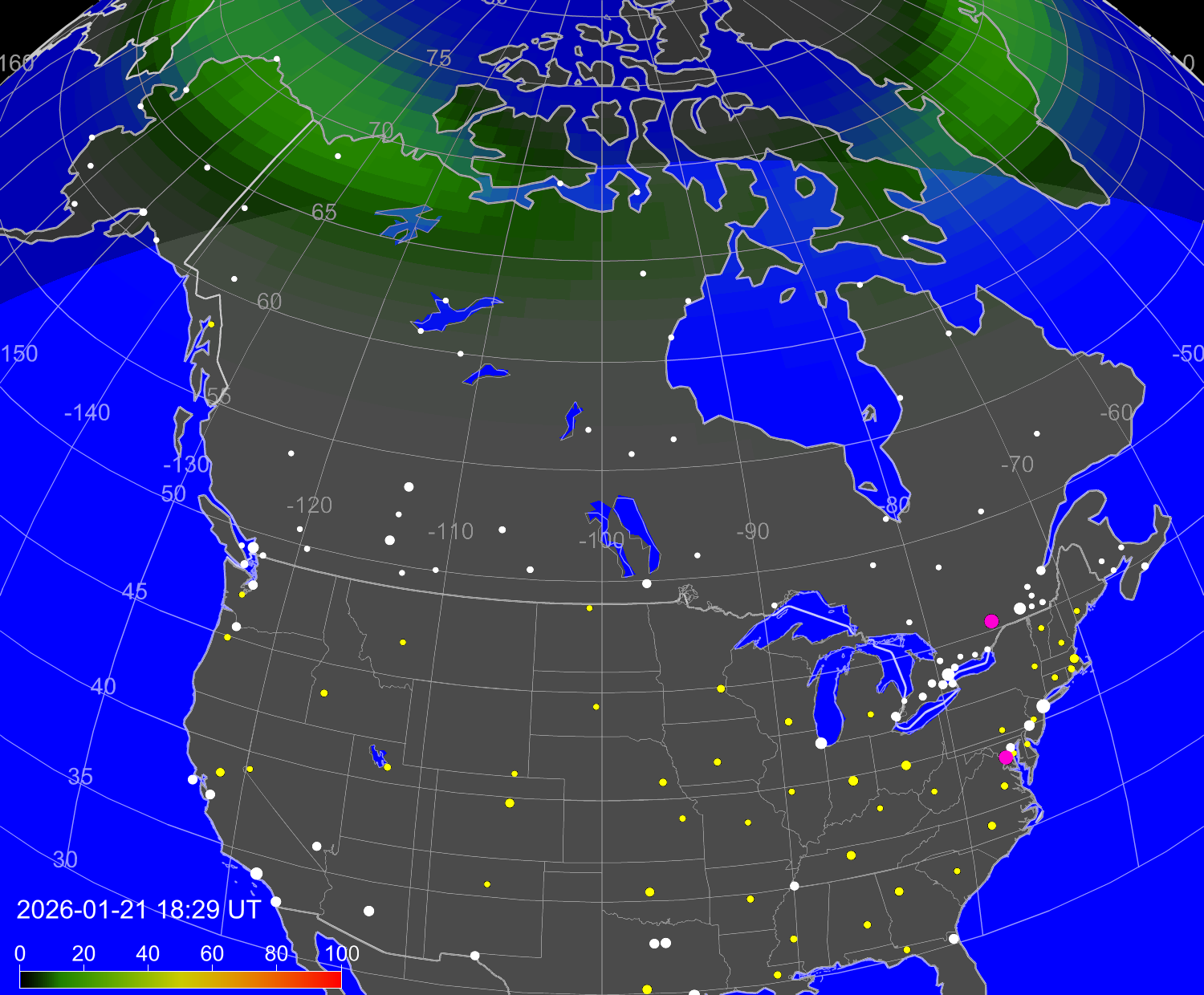 Индекс интенсивности полярных сияний и теоретически возможная широта наблюдений для ночного времени в западном полушарии