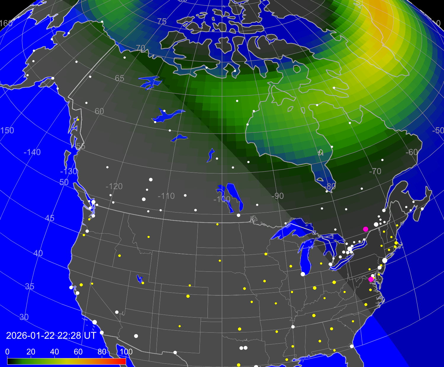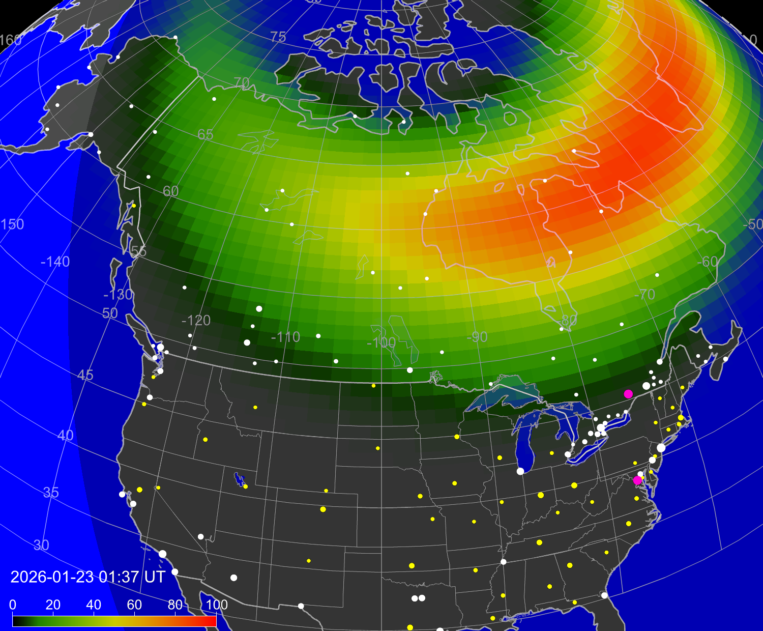 Изменения и часовой прогноз индекса интенсивности полярных сияний с 2026-01-22 по 2026-01-23