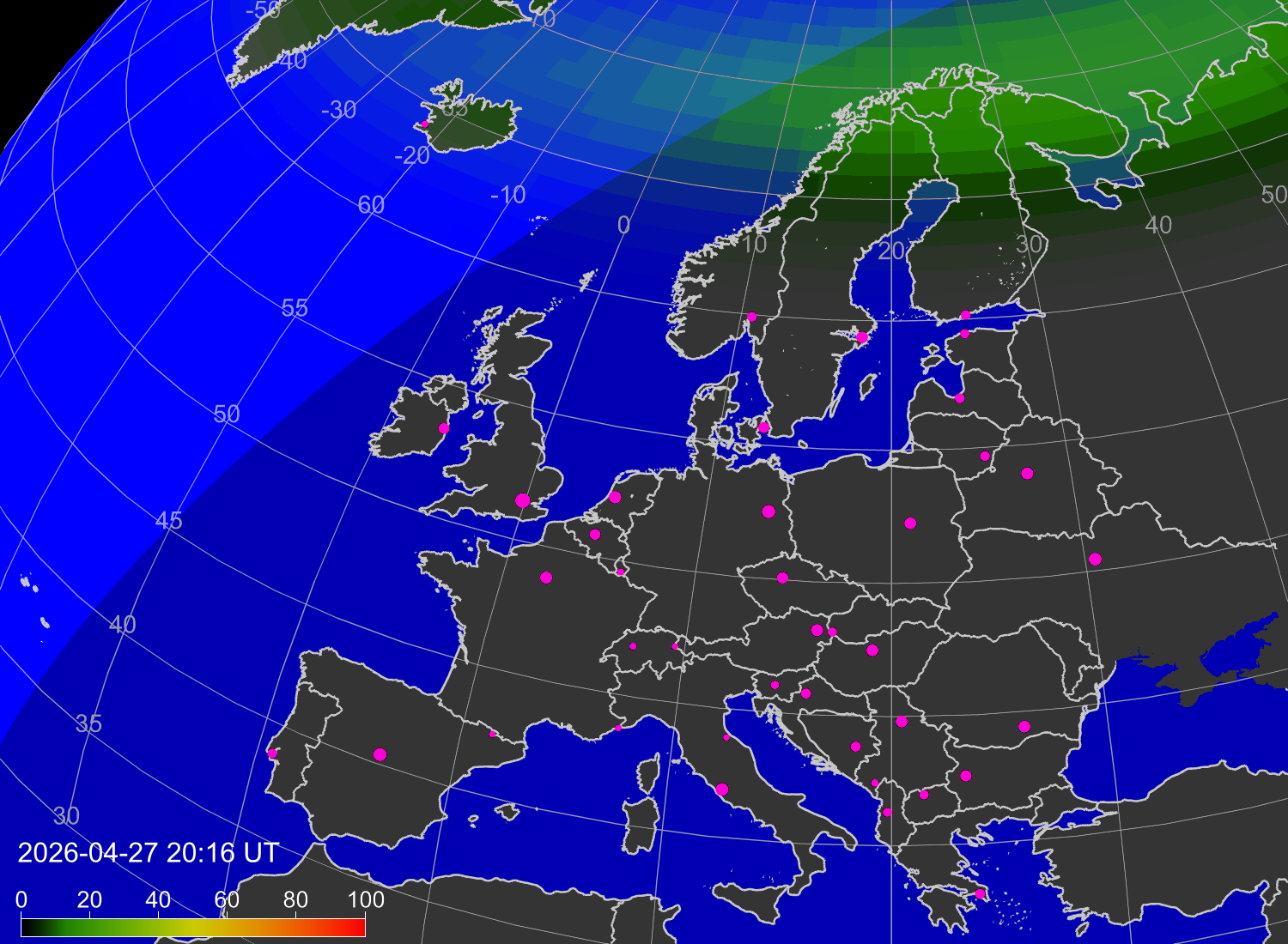 Индекс интенсивности полярных сияний и теоретически возможная широта наблюдений для ночного времени в восточном полушарии