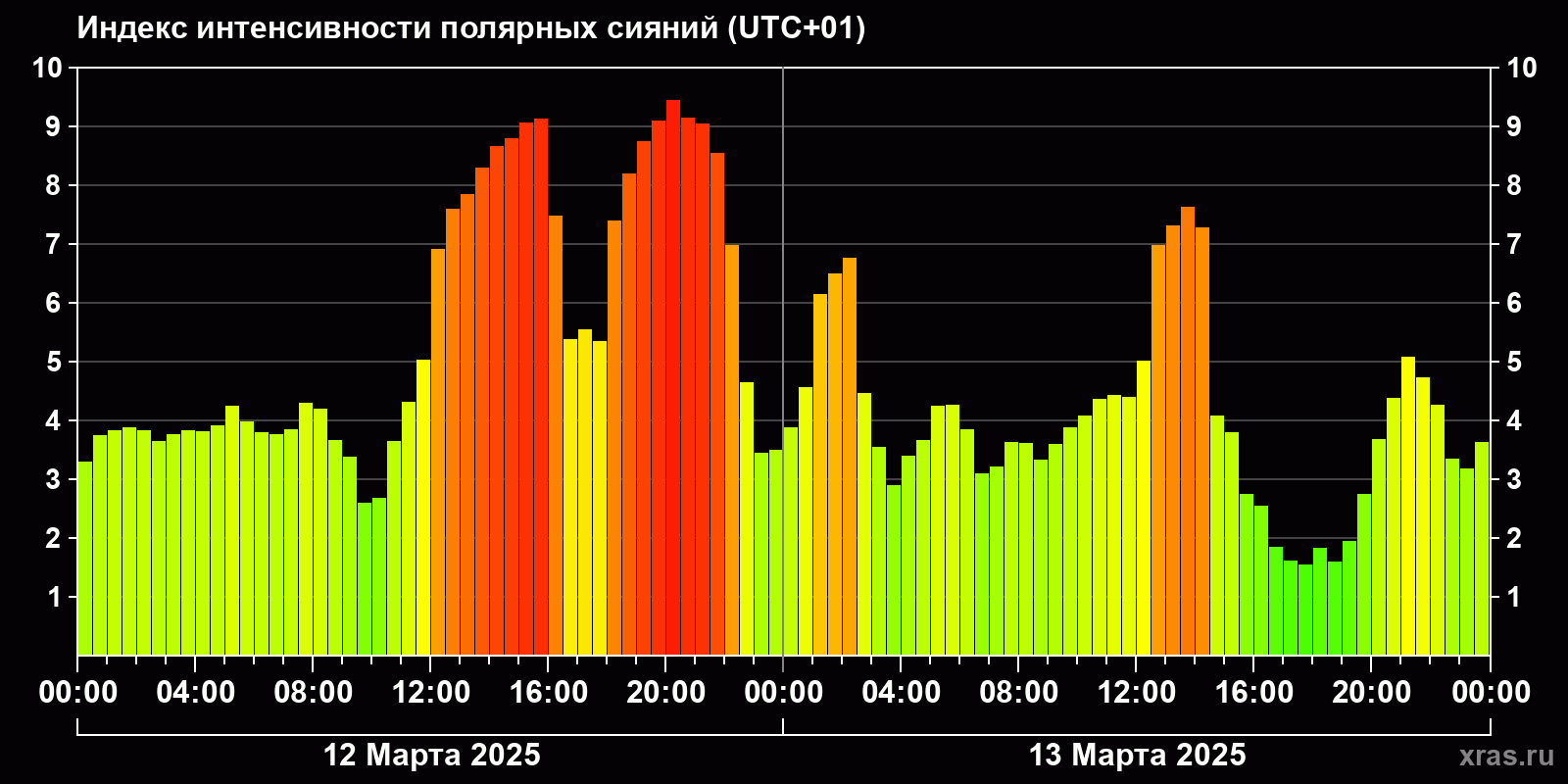 Изменения индекса интенсивности полярных сияний с 2025-03-12 по 2025-03-13 по местному времени