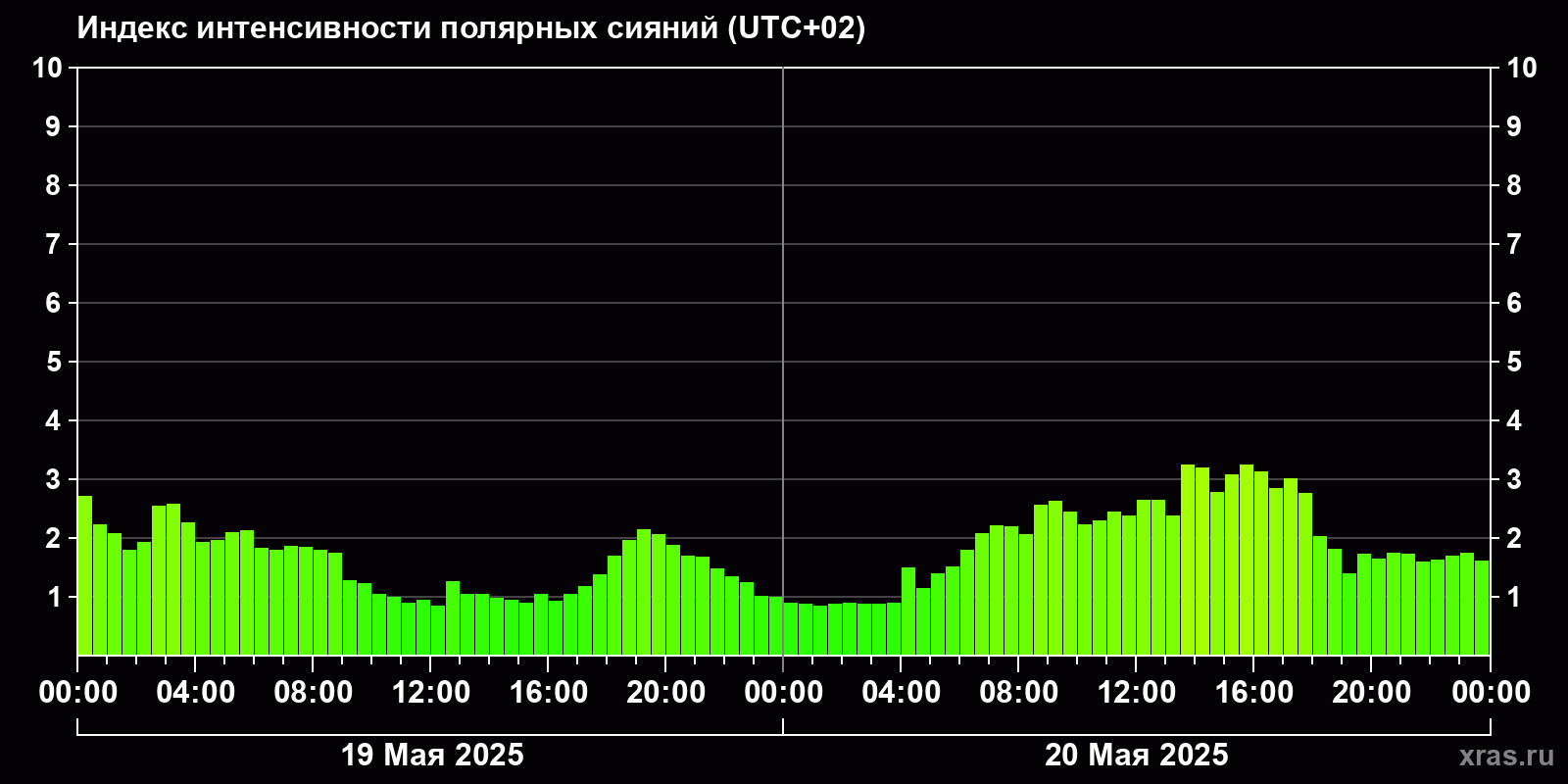 Изменения индекса интенсивности полярных сияний с 2025-05-19 по 2025-05-20 по местному времени