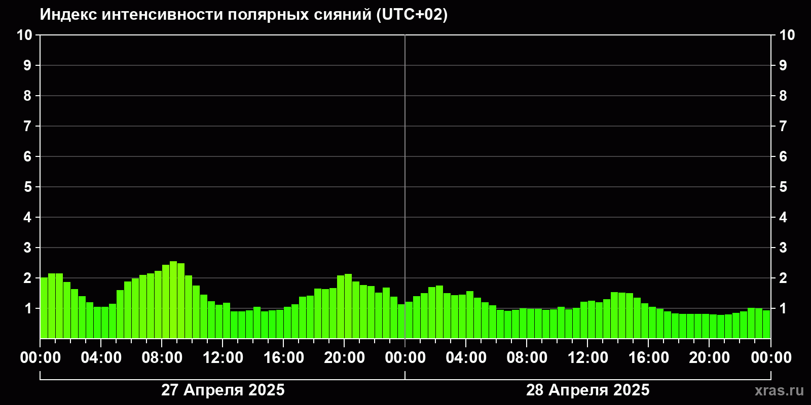 Изменения индекса интенсивности полярных сияний с 2025-04-27 по 2025-04-28 по местному времени