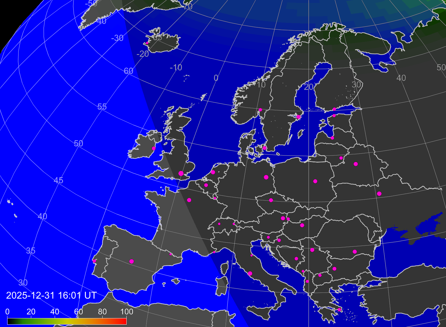 Вероятность полярных сияний в городах Европы