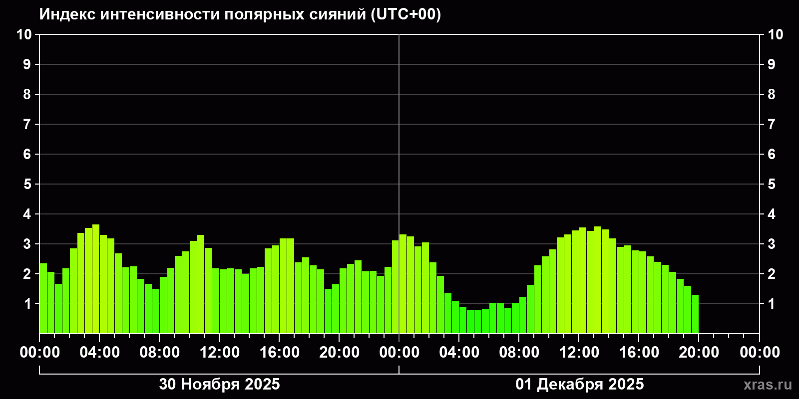 Изменения индекса интенсивности полярных сияний с 2025-11-30 по 2025-12-01 по местному времени