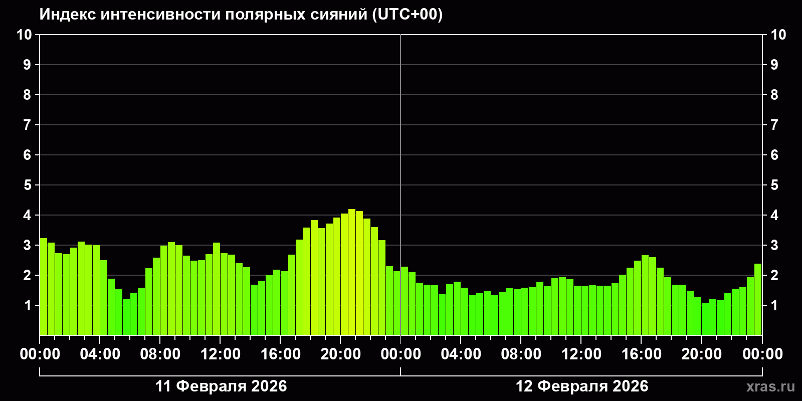 Изменения индекса интенсивности полярных сияний с 2026-02-11 по 2026-02-12 по местному времени
