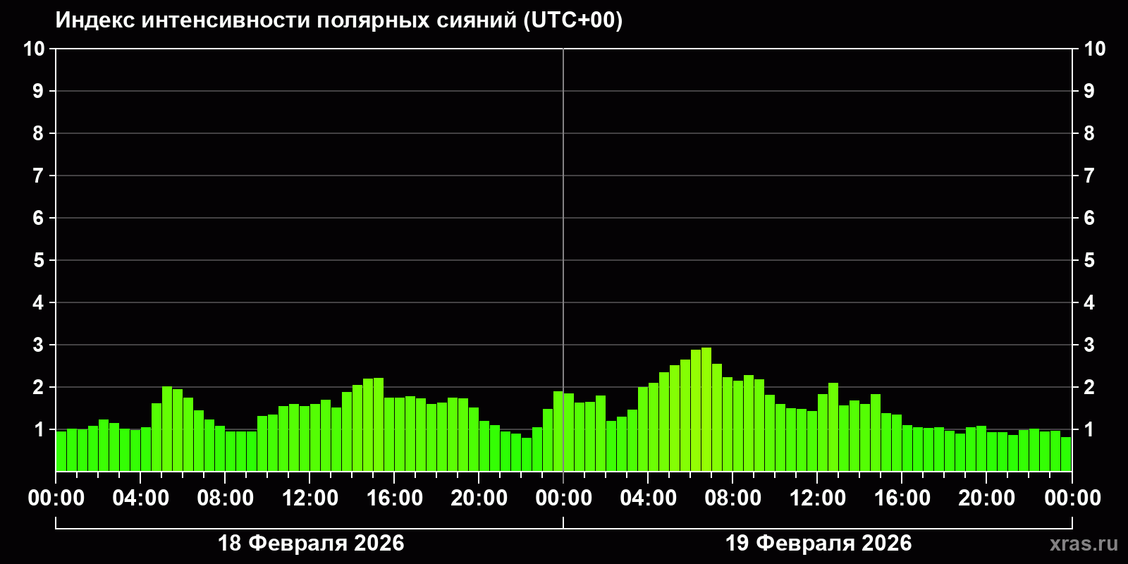 Изменения индекса интенсивности полярных сияний с 2026-02-18 по 2026-02-19 по местному времени