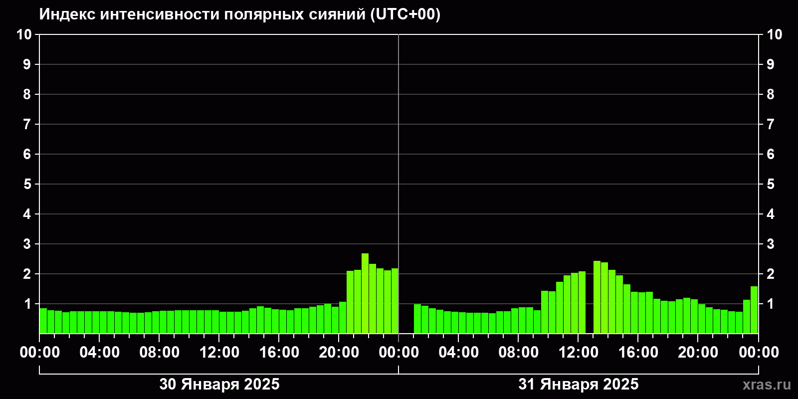 Изменения индекса интенсивности полярных сияний с 2025-01-30 по 2025-01-31 по местному времени