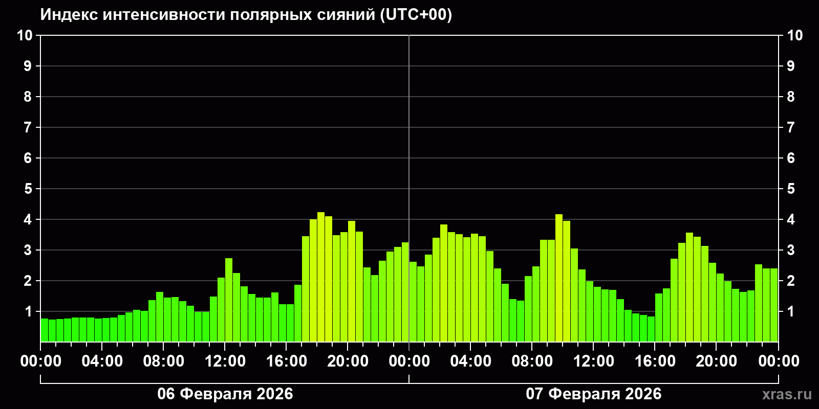 Изменения индекса интенсивности полярных сияний с 2026-02-06 по 2026-02-07 по местному времени
