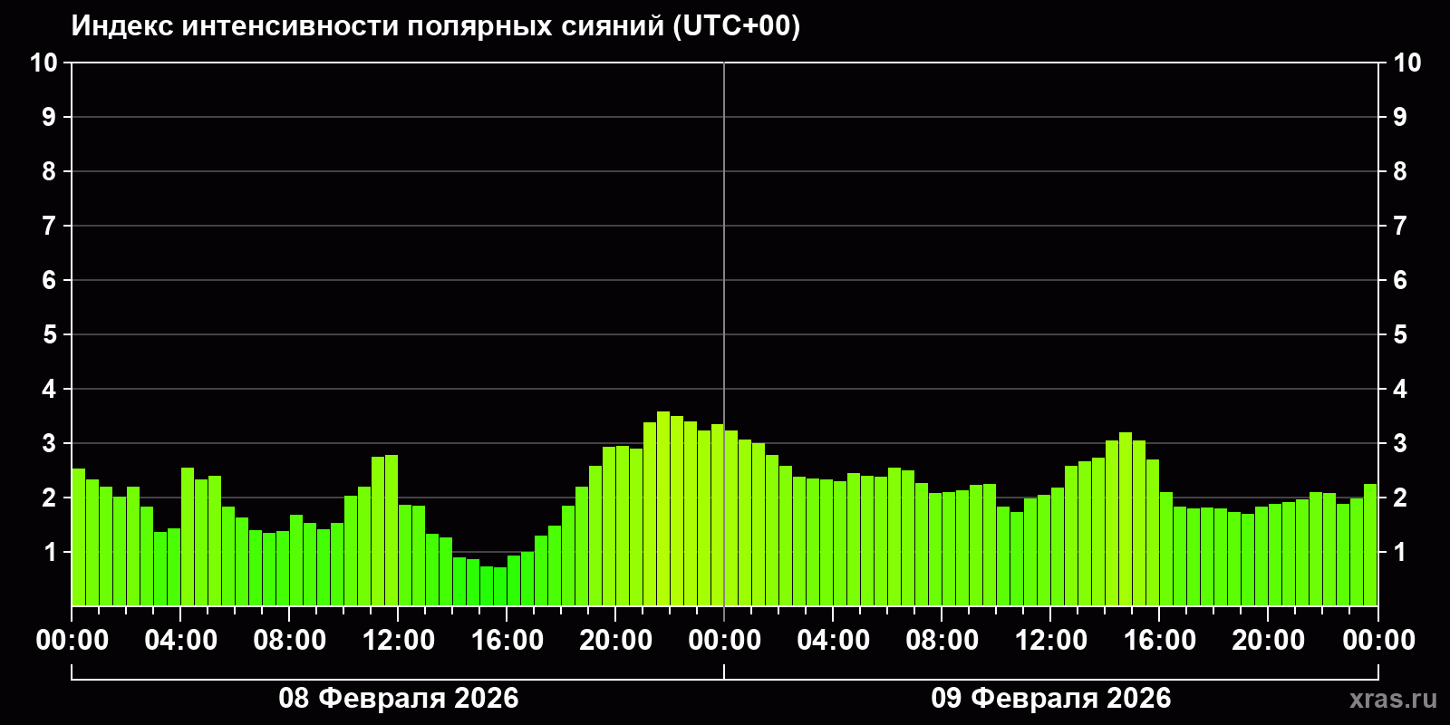 Изменения индекса интенсивности полярных сияний с 2026-02-08 по 2026-02-09 по местному времени