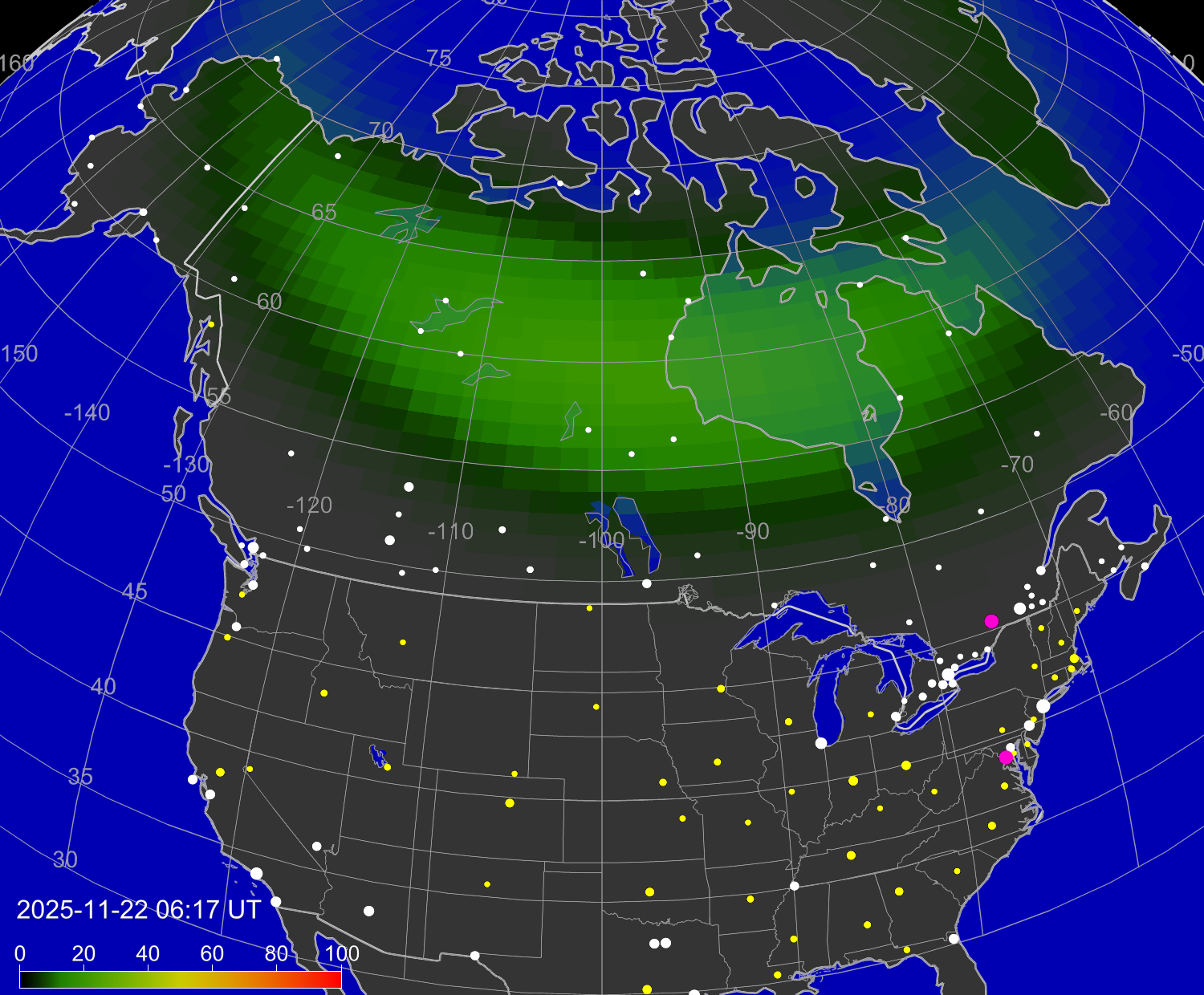 Вероятность полярных сияний Лондоне (Канада)