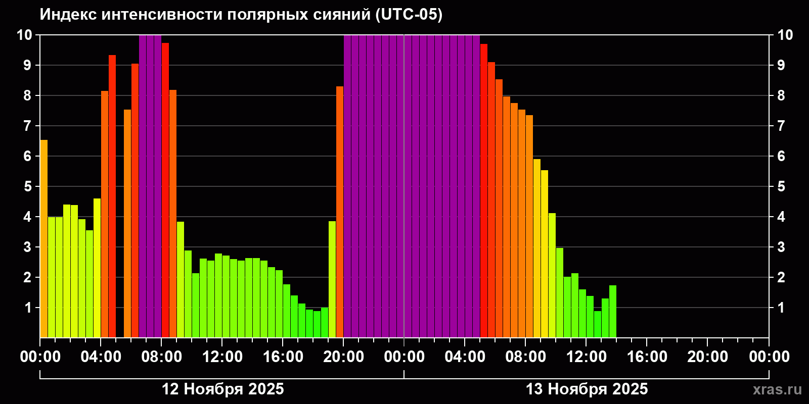 Изменения индекса интенсивности полярных сияний с 2025-11-12 по 2025-11-13 по местному времени