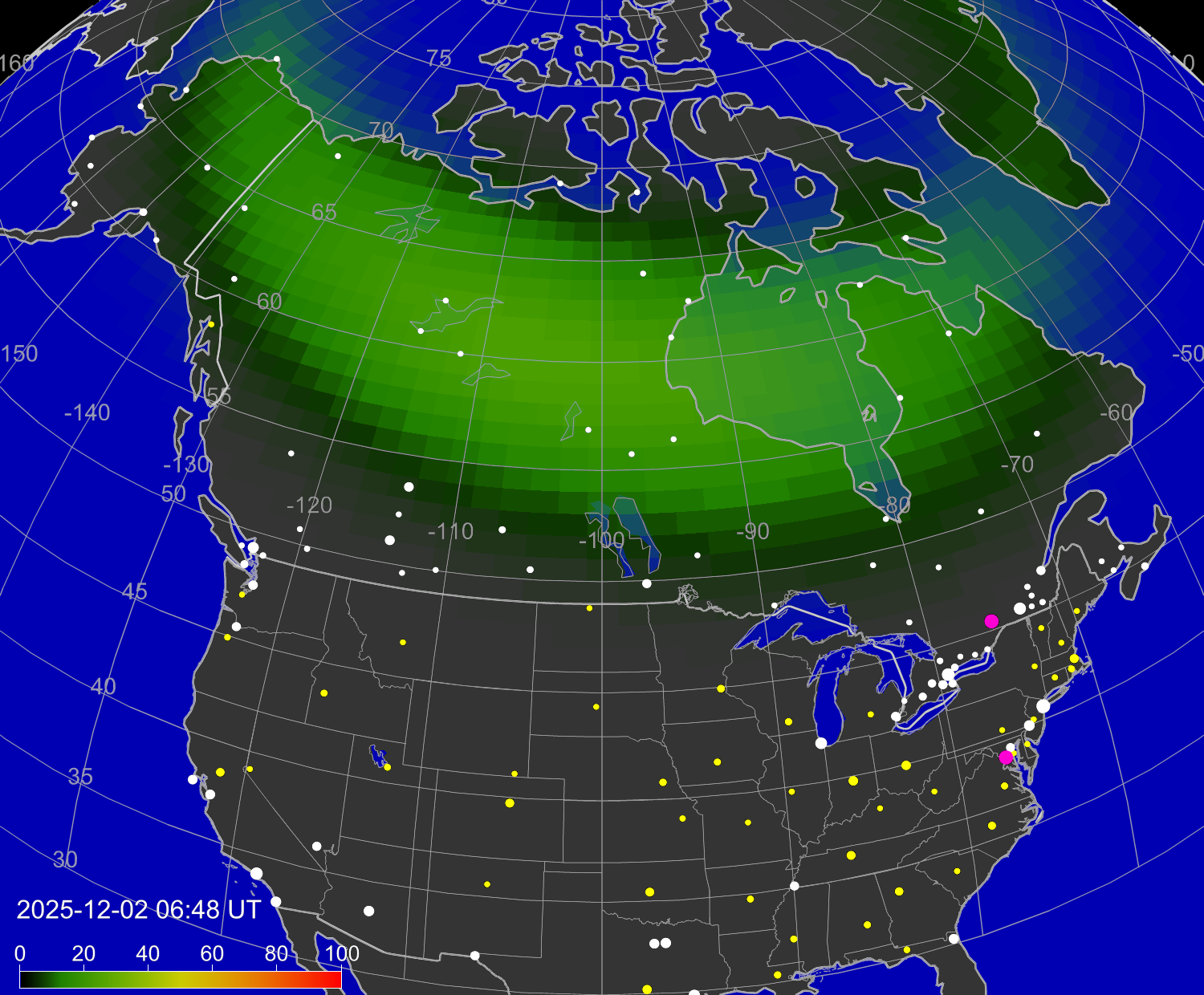 Изменения и часовой прогноз индекса интенсивности полярных сияний с 2025-11-30 по 2025-12-01