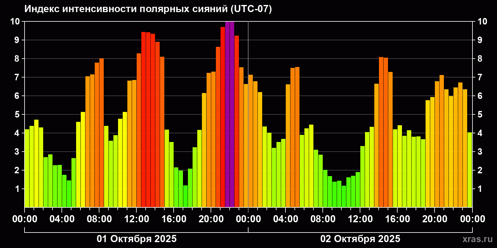 Изменения индекса интенсивности полярных сияний с 2025-10-01 по 2025-10-02 по местному времени