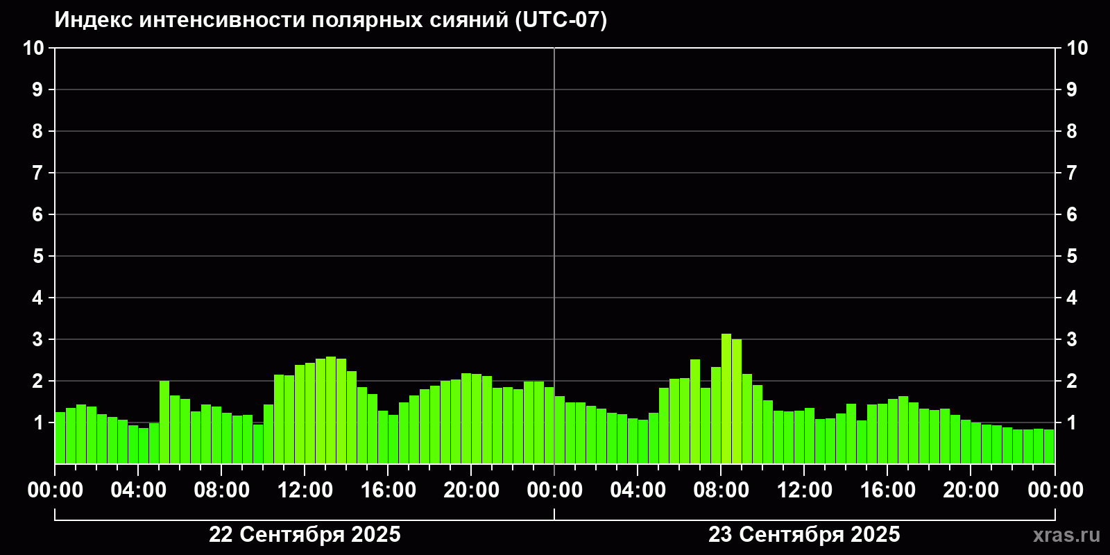 Изменения индекса интенсивности полярных сияний с 2025-09-22 по 2025-09-23 по местному времени