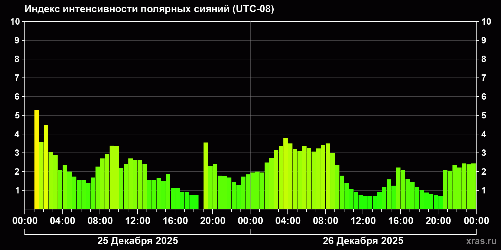Изменения индекса интенсивности полярных сияний с 2025-12-25 по 2025-12-26 по местному времени
