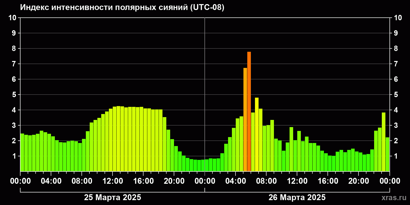 Изменения индекса интенсивности полярных сияний с 2025-03-25 по 2025-03-26 по местному времени
