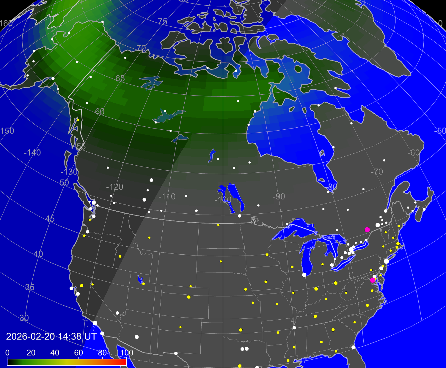 Индекс интенсивности полярных сияний и теоретически возможная широта наблюдений для ночного времени в западном полушарии