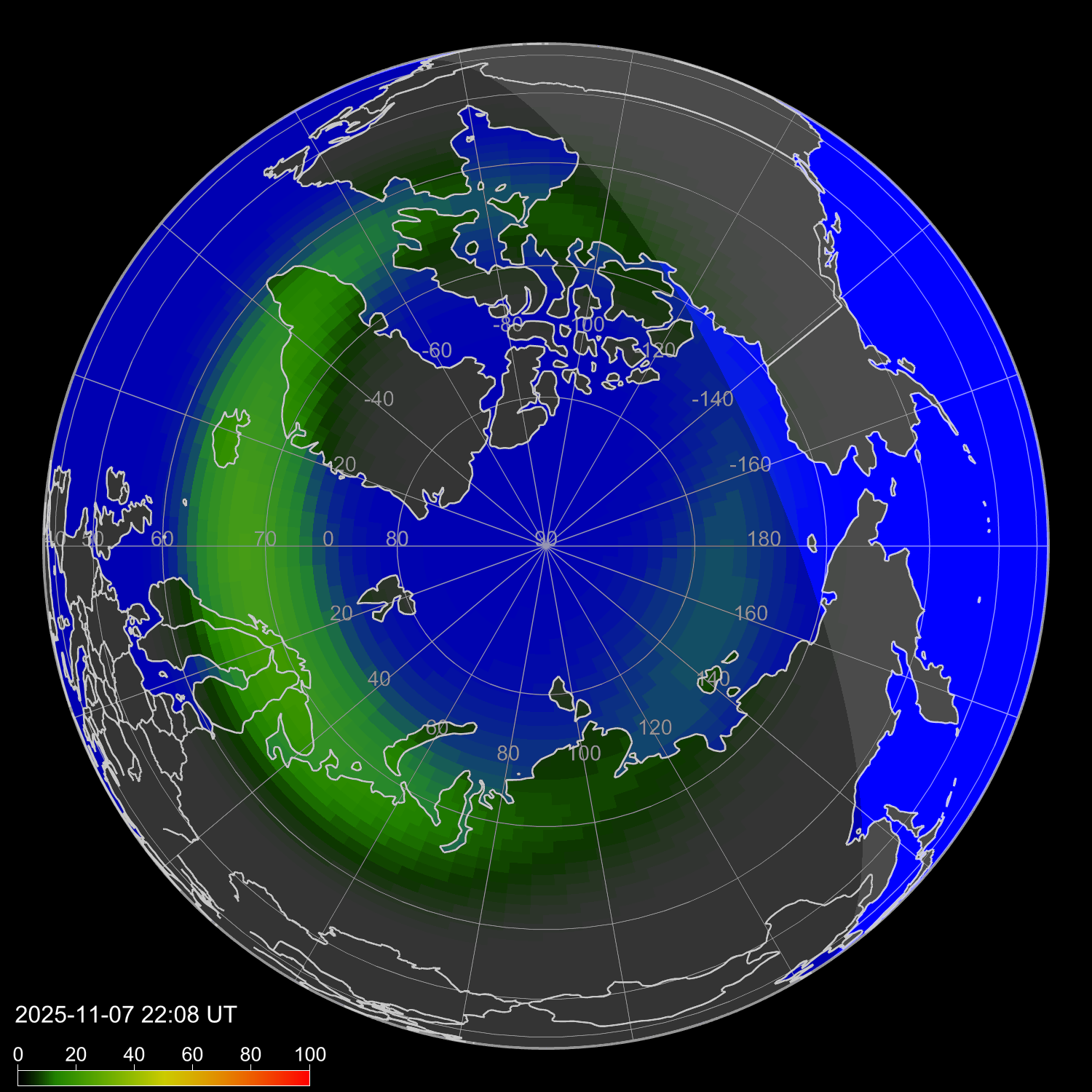 Изменения и часовой прогноз индекса интенсивности полярных сияний с 2025-11-06 по 2025-11-07