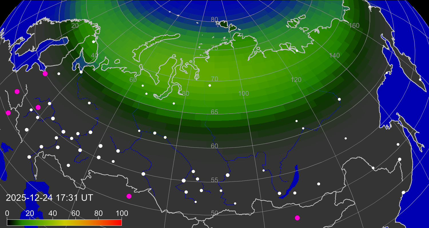 Изменения и часовой прогноз индекса интенсивности полярных сияний с 2025-12-23 по 2025-12-24