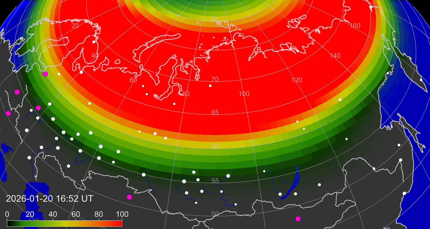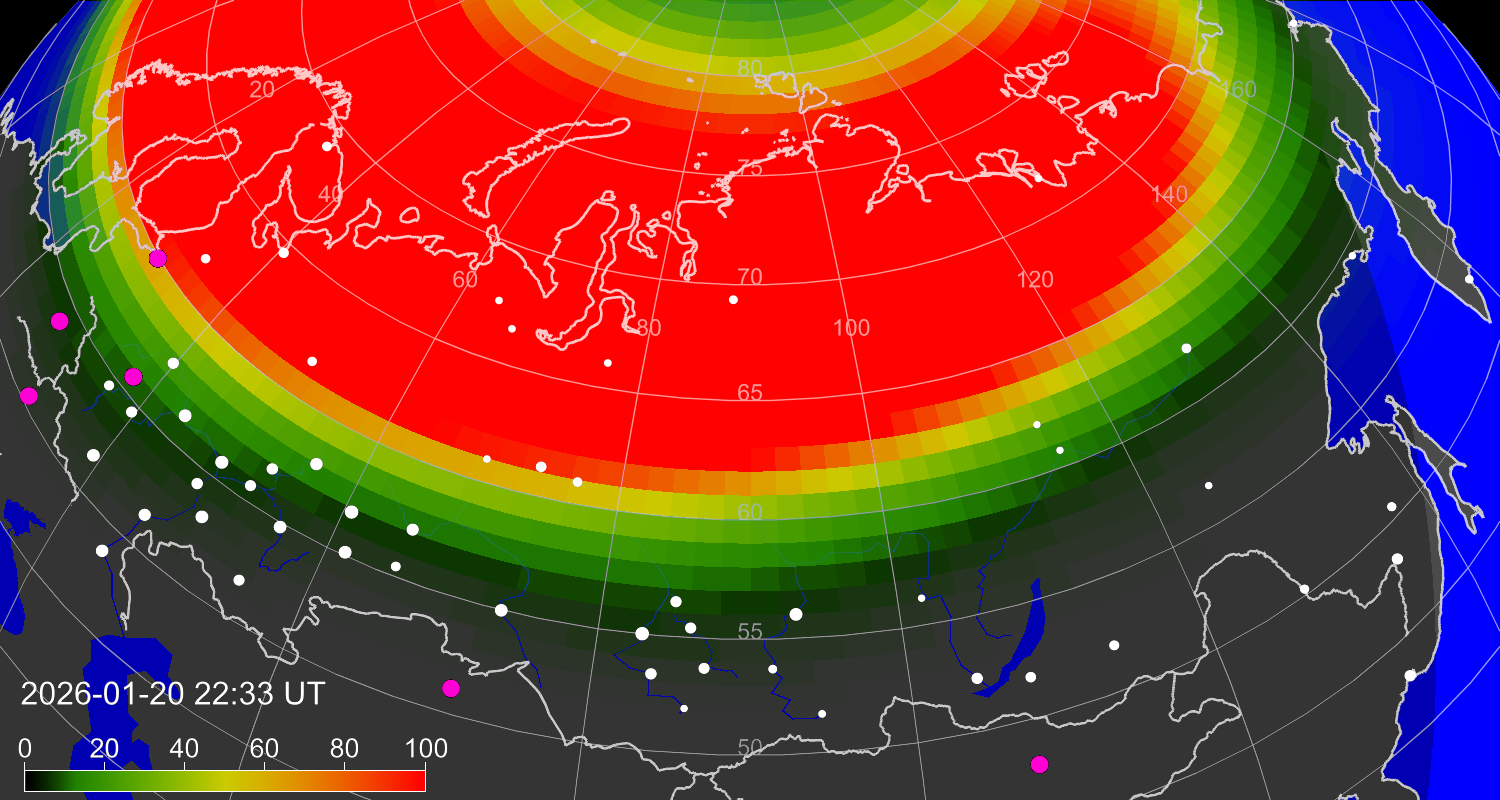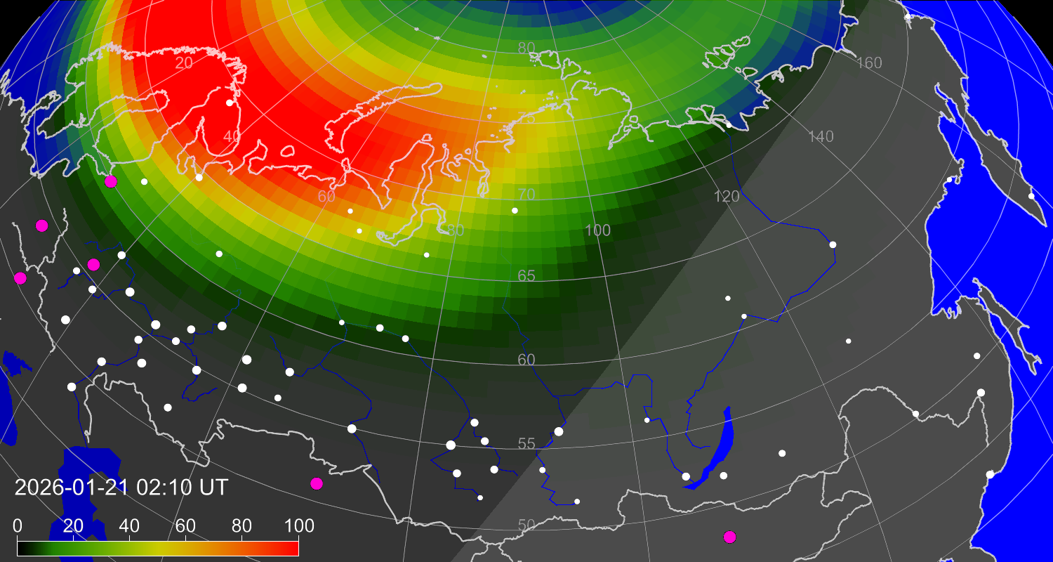 Изменения и часовой прогноз индекса интенсивности полярных сияний с 2026-01-20 по 2026-01-21