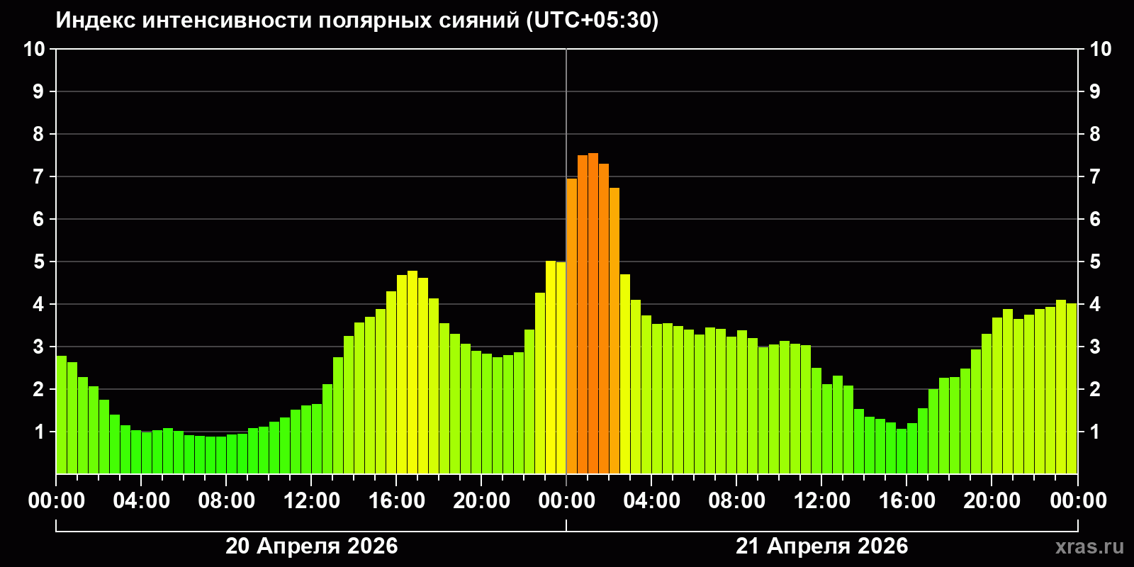 Изменения индекса интенсивности полярных сияний с 2026-04-20 по 2026-04-21 по местному времени