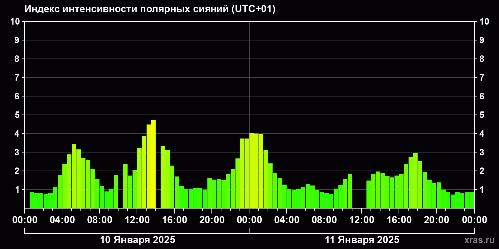 Изменения индекса интенсивности полярных сияний с 2025-01-10 по 2025-01-11 по местному времени