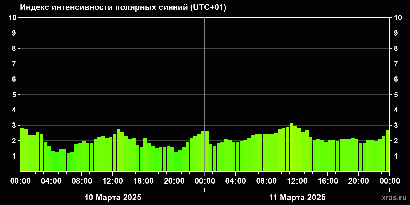 Изменения индекса интенсивности полярных сияний с 2025-03-10 по 2025-03-11 по местному времени